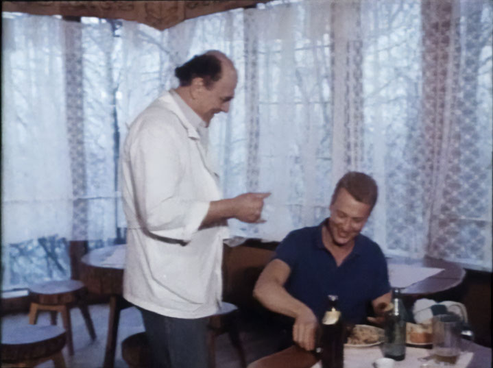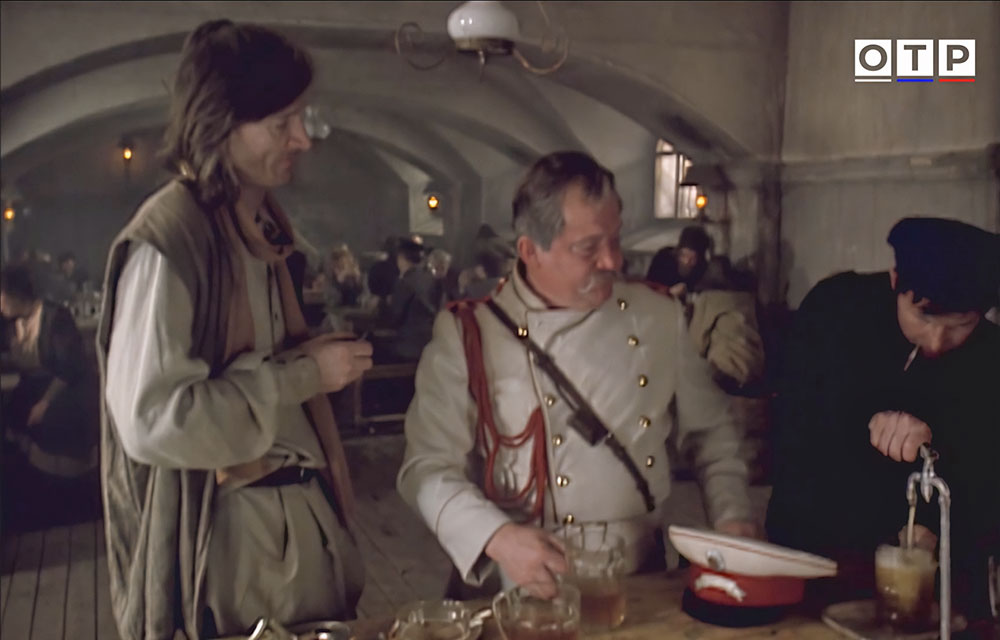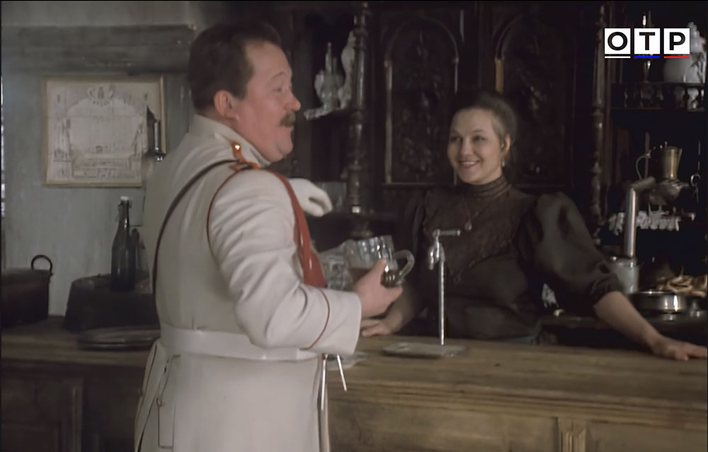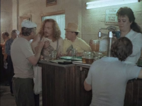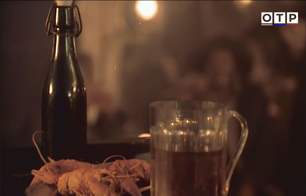 | Кроме пивной палатки, мы видим и пивную, расположенную прямо на ипподроме. Здесь имеется как разливное пиво, так и бутылочное. Скорее всего и то и другое - местного "Псковского пивзавода" - "Жигулевское", бутылочное почти точно, на этикетке слева явно видно черную кляксу - вероятно являющуюся гербом завода. Пиво пьют из общепитовских кружек, конечно подкрепляя выпитое водкой. Герой пьет водку из рюмки, но рассказывает байку - что правильнее ее называть лафитником (в этом он не прав). Пиво-медоваренный завод в Пскове построил Г. Г. Даниэльс в 1883 году (другие даты основания - 1884 и 1886 гг.). Еще до Революции - его чуть не снесли во время строительства моста для железной дороги Псков - Рига. Но завод пережил и Революцию, и Гражданскую с Великой Отечественной войной и закрыт был только в 1997-м году. Кстати, на Ипподромной улице в Пскове, в середине 70-х годов заработал еще один пивзавод, на базе местного пищекомбината облпотребсоюза, с югославским оборудованием. Но в кадре точно пиво не от него, так как этикетки "Жигулевского" у него были совсем другого - "потребсоюзовского" дизайна. |