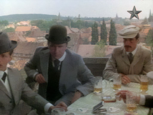 | "Две строчки мелким шрифтом" - художественный фильм, драма режиссера Виталия Мельникова снятая на Киностудии "Ленфильм" ("Первое творческое объединение") и восточно-германской DEFA (Студия художественных фильмов, Группа Бабельсберг) в 1981-м году. Фильм рассказывает о советском историке, расследующем обстоятельства предательства в большевистском подполье накануне I-ой мировой войны. И сцена в немецком биргартене относится к 1912-му году. Судя по всему снимали в Виттенберге, бывал я там четверть века назад, но что-то пропустил столь красивое местечко. Большевики пьют пиво из цилиндрических кружек похожих на современные. Город не славился своими пивоварнями, но с 1902-го года в нем работала Wittenberger Brauhaus, сейчас эта пивоварня не действует. Я пил там пиво под брендом "Luther", Мартин Лютер был тесно связан с Виттенбергом (второе название которого - Лютерштадт). | ||||||||||||||||||||||||||||||