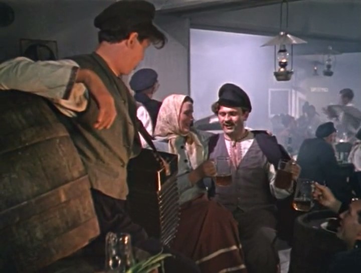 | "Любимая девушка" - черно-белый художественный фильм снятый режиссером Иваном Пырьевым на киностудии "Мосфильм" в 1940-м году. Фильм снят по книге Павла Нилина "Варя Лугина и ее первый муж", написанной в 1936-м году. В одной из сцен, отцы главных героев пьют пиво в кафе. Пиво - бутылочное, "Жигулевское", скорее всего пивзавода имени Бадаева. Бутылка - похоже 0,5 л. и с горлышком под кронен-пробку. Интересные кружки - цилиндрические, с частыми гранями и с кругом (но без герба) посередине. Интересно и то, что сразу после наливания пива из бутылки в кружку герой солит пиво беря соль в солонке. |