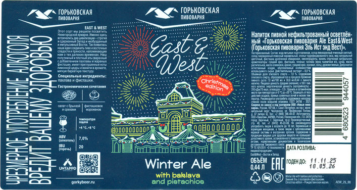 | "Горьковская пивоварня" (сварено на "Пиватоме"), "Горьковская пивоварня, эль Ист энд Вест". Рождественская версия пива с явным вкусом орешков (в том числе фисташек), ванили и печеньки. Довольно ярко, даже несколько напрягающе. |