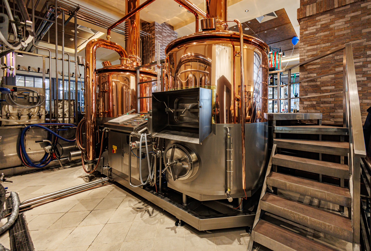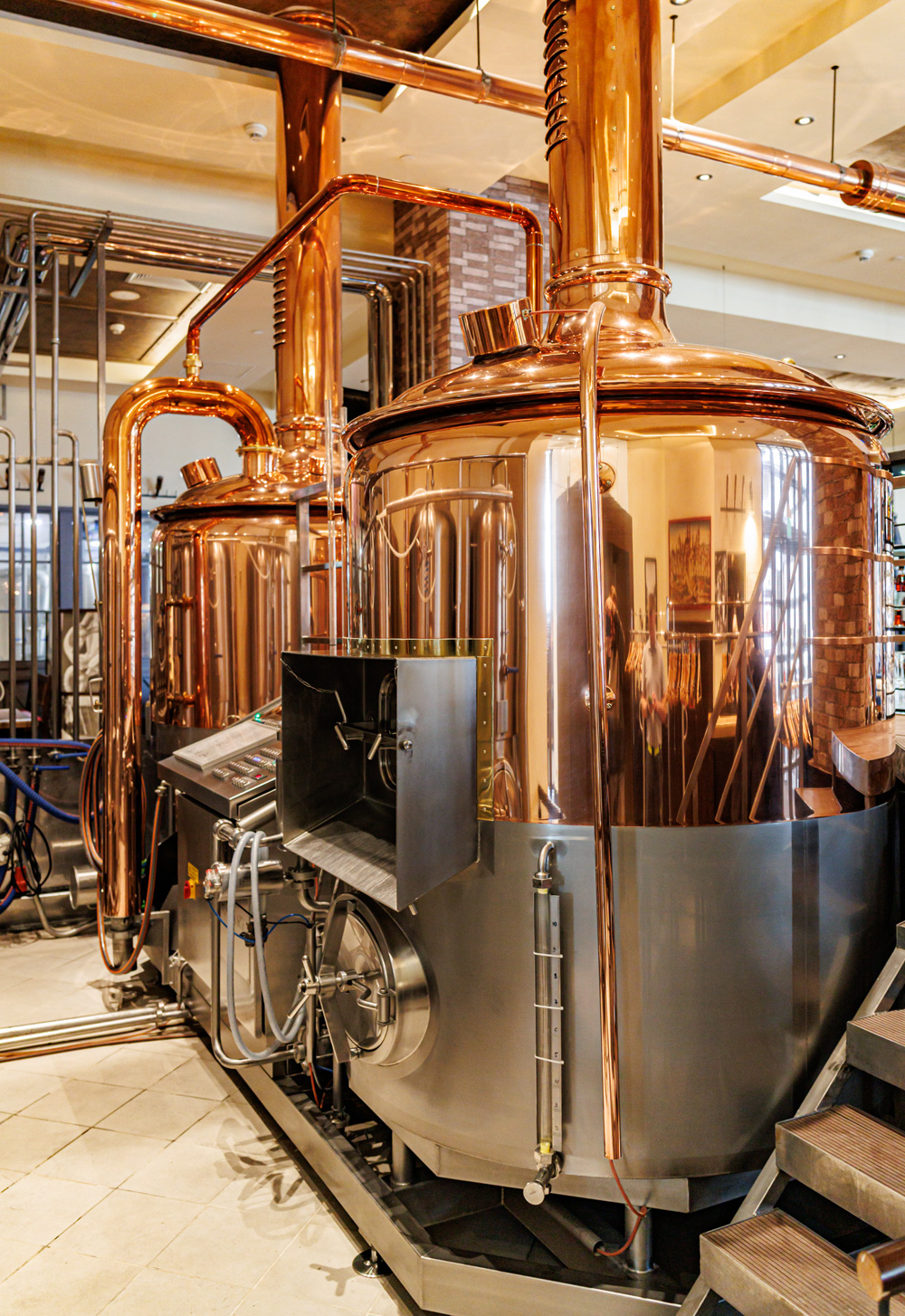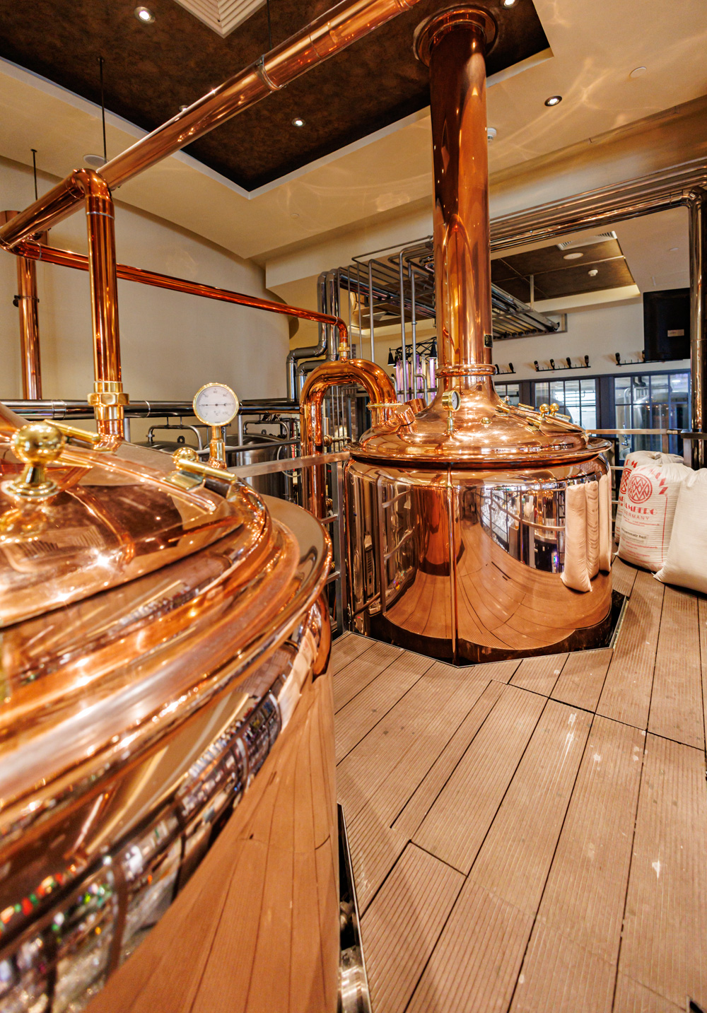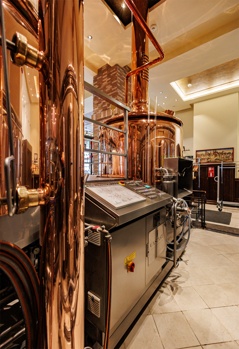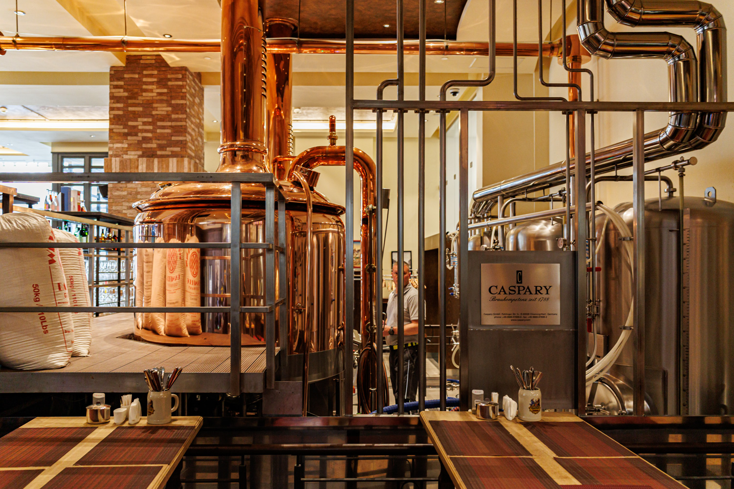 Совсем рядом с Maximilian's, на той же улице Труда (но дом 179) расположен ресторан-пивоварня еще одной сети - Paulaner brauhaus (в здании Radisson Blu Hotel). Тоже посетил не один такой Paulaner и тоже могу сказать что челябинский - один из лучших. Интерьер ресторана вполне типичный, в стиле баварских пивных, посреди большого зала, за стойкой, установлен варочный порядок пивоварни от компании Caspary, отделанный медью и начищенный до блеска. Удалось посмотреть не только варочник, Максим Сапожников, главный пивовар, провел экскурсию и по цеху брожения. Брожение проводится в открытых танках, что встретишь не так уж часто, дображивание в закрытых вертикальных емкостях.