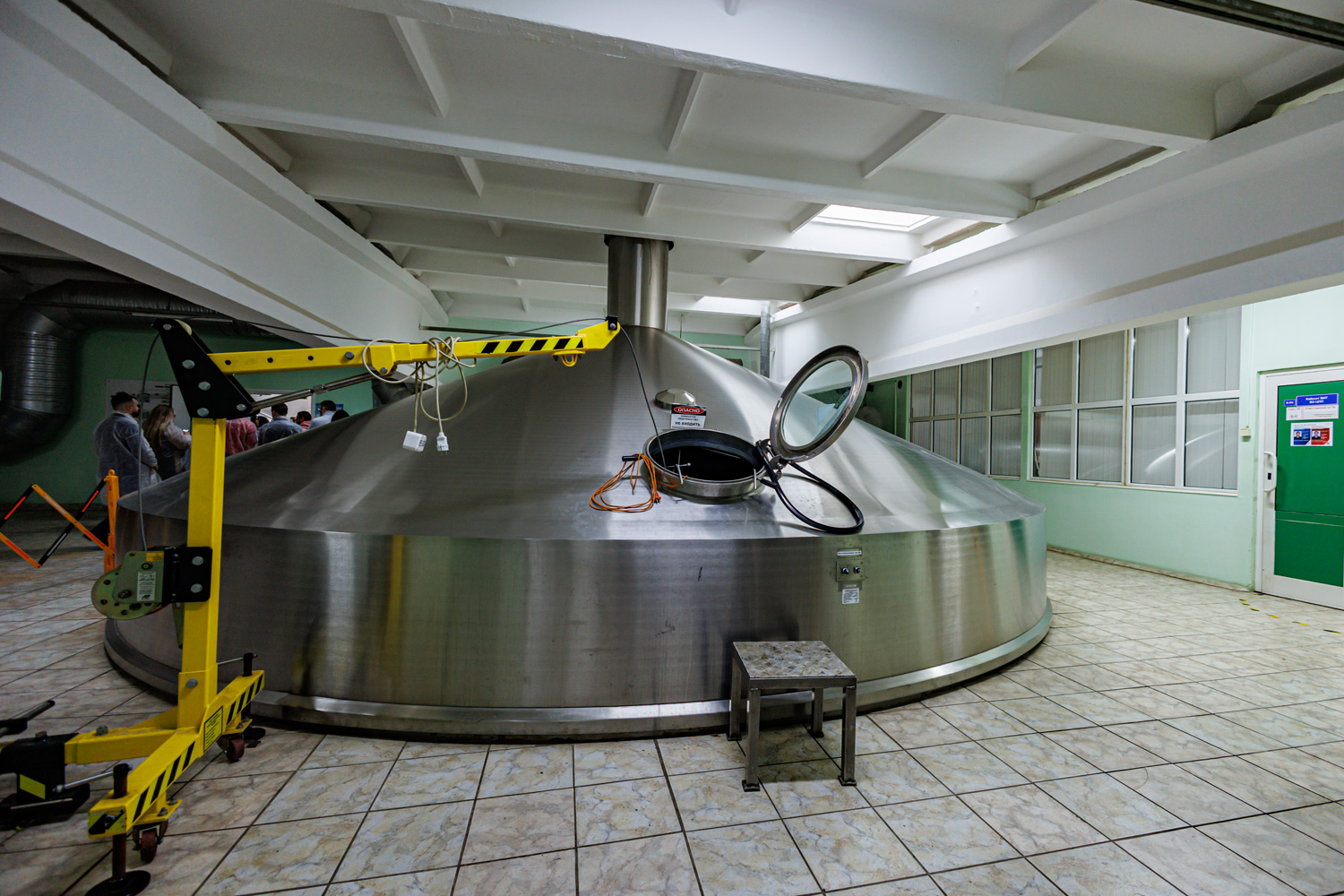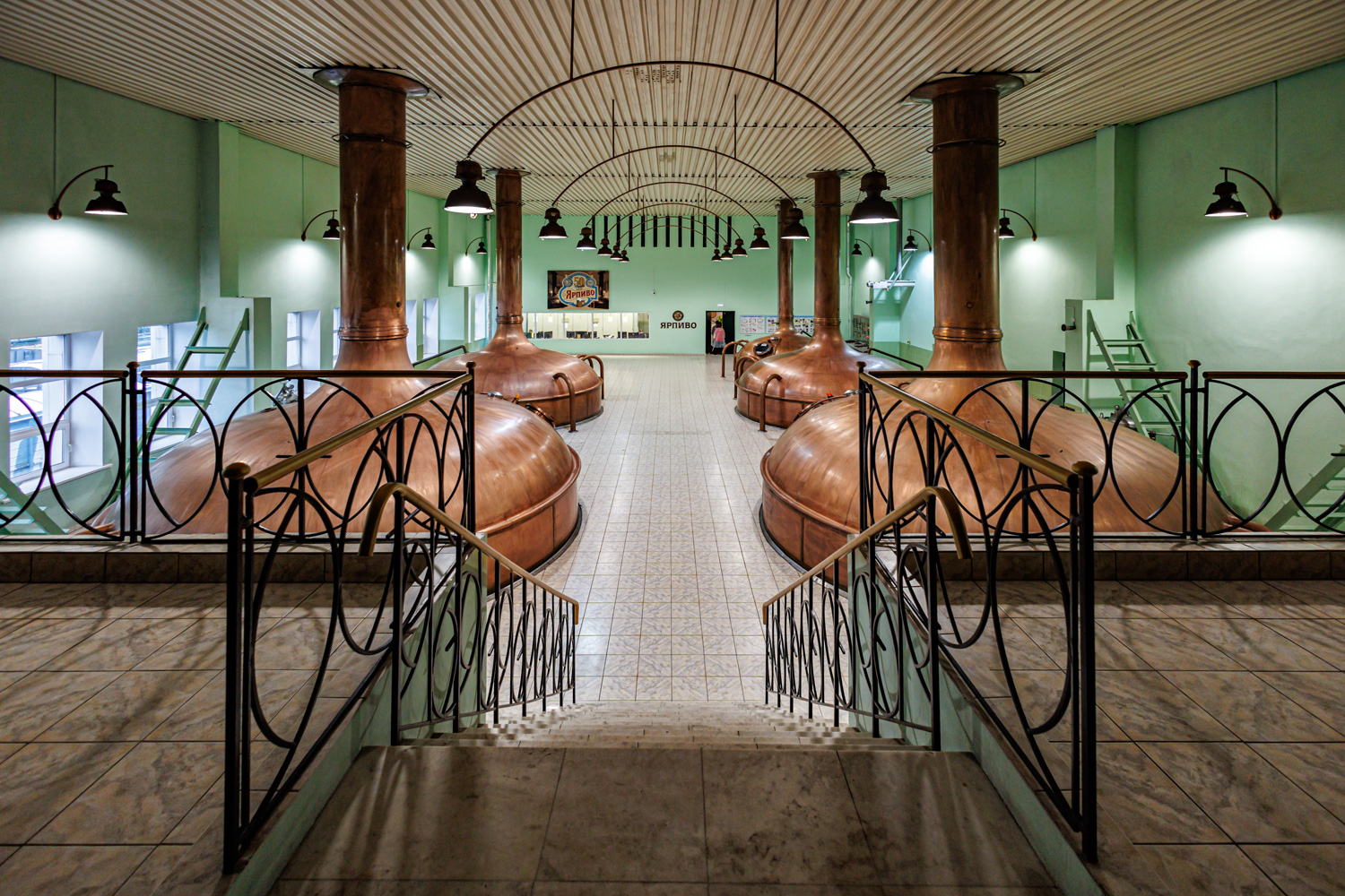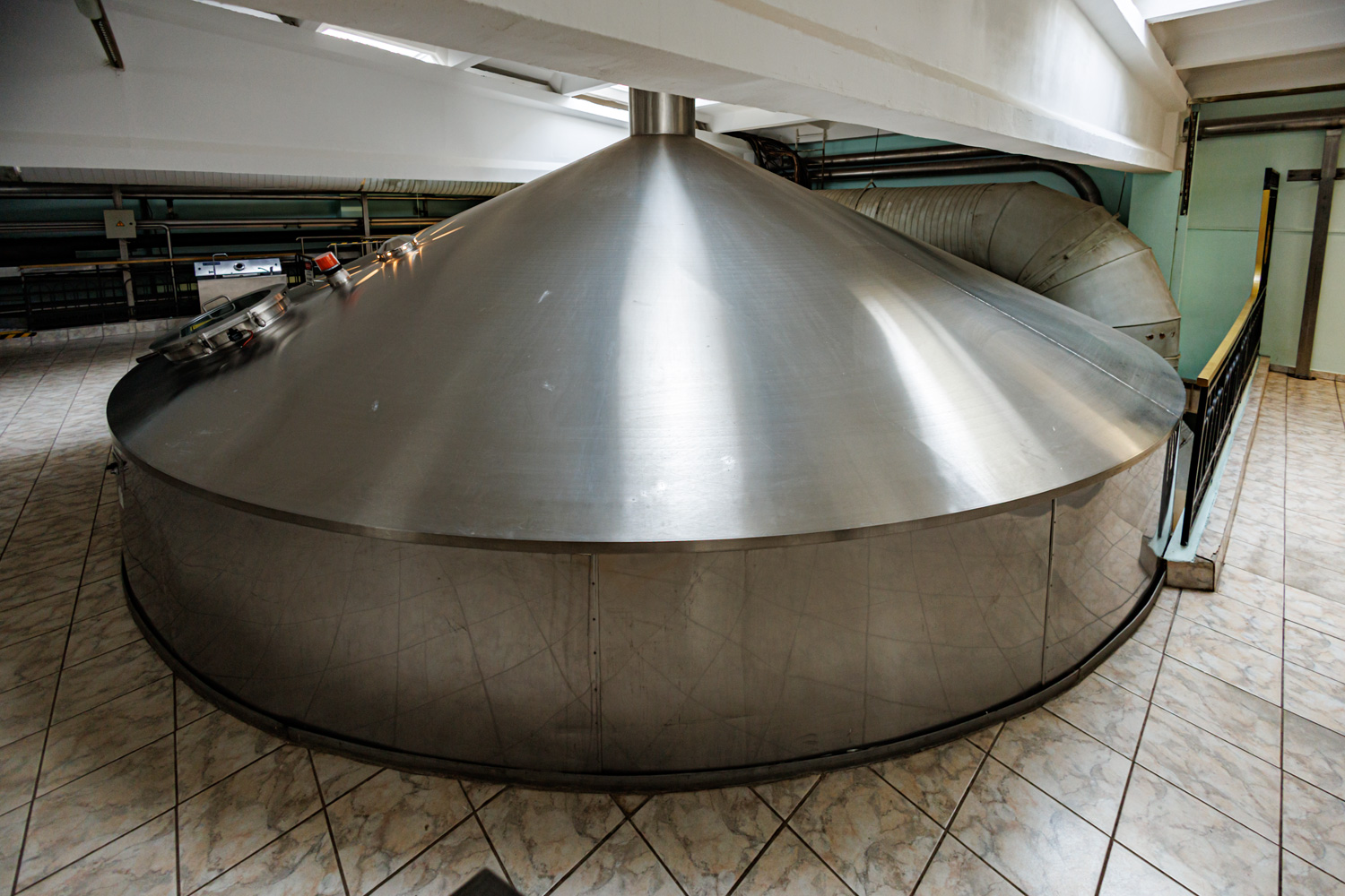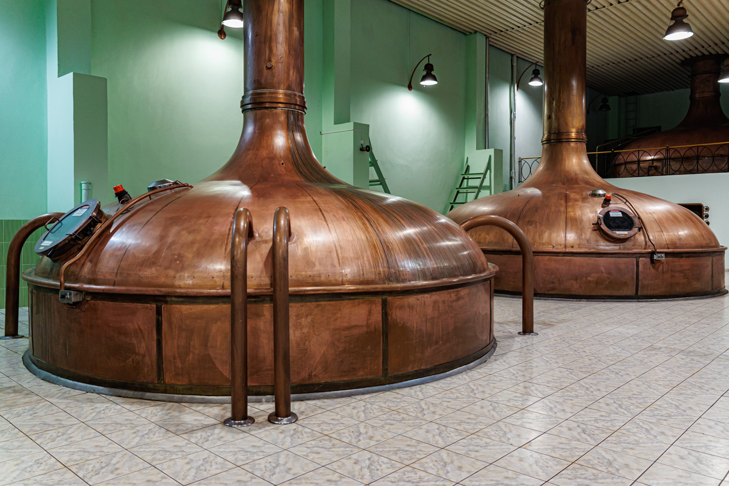 | Варочный цех. Сохранились медные чехословацкие котлы, но они используются только как облицовка для современных котлов из нержавейки. Старый пульт управления варкой тоже оставлен как музейный экспонат, сейчас все управление производится с помощью компьютеров из операторской. | ||||||||||||||||||||||||||||||||