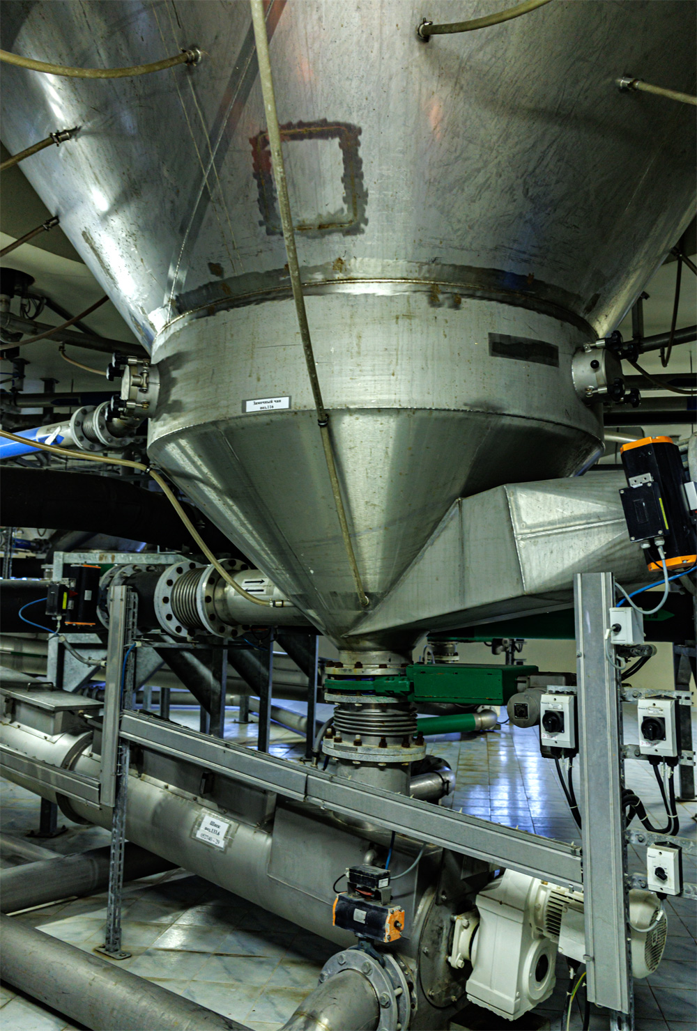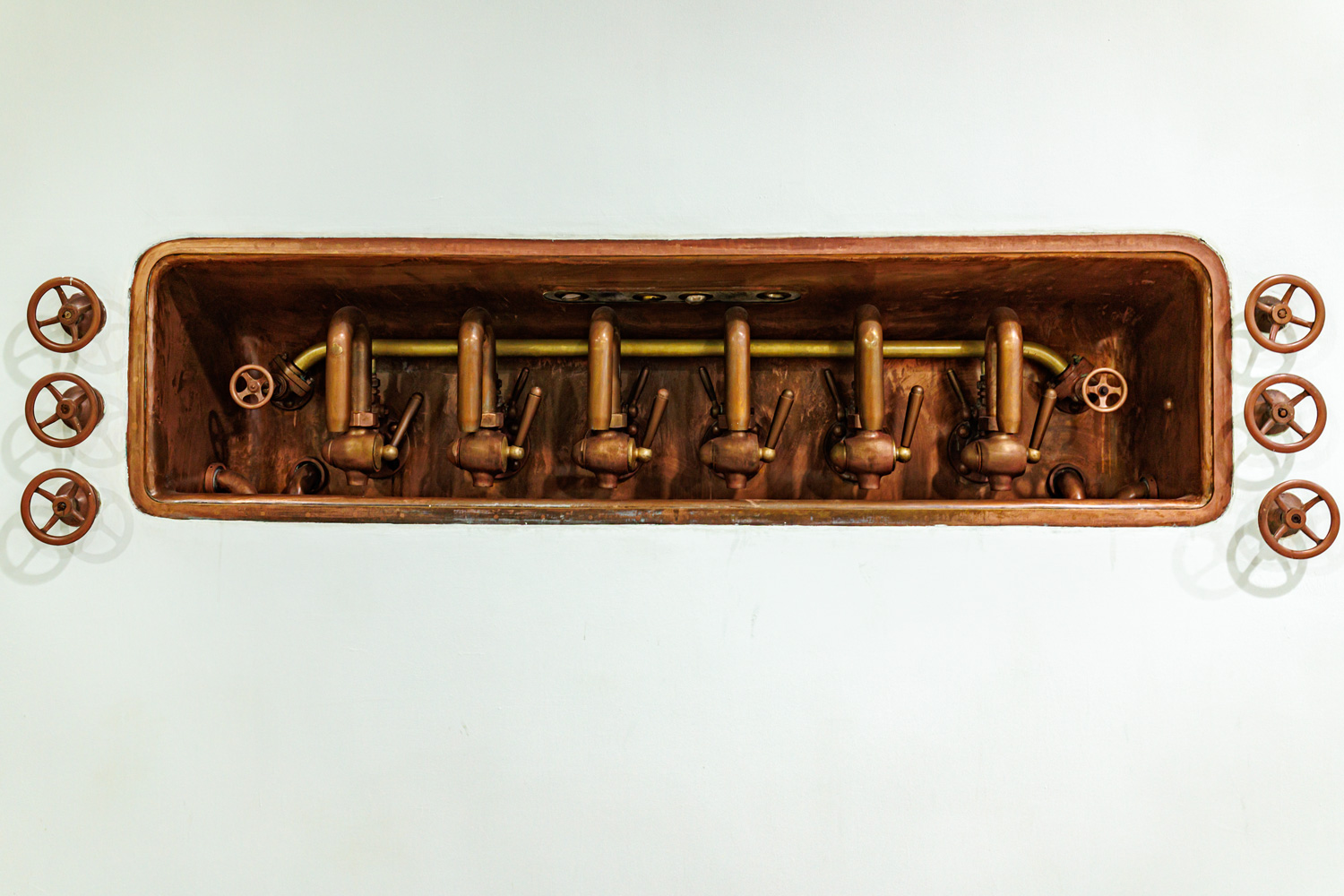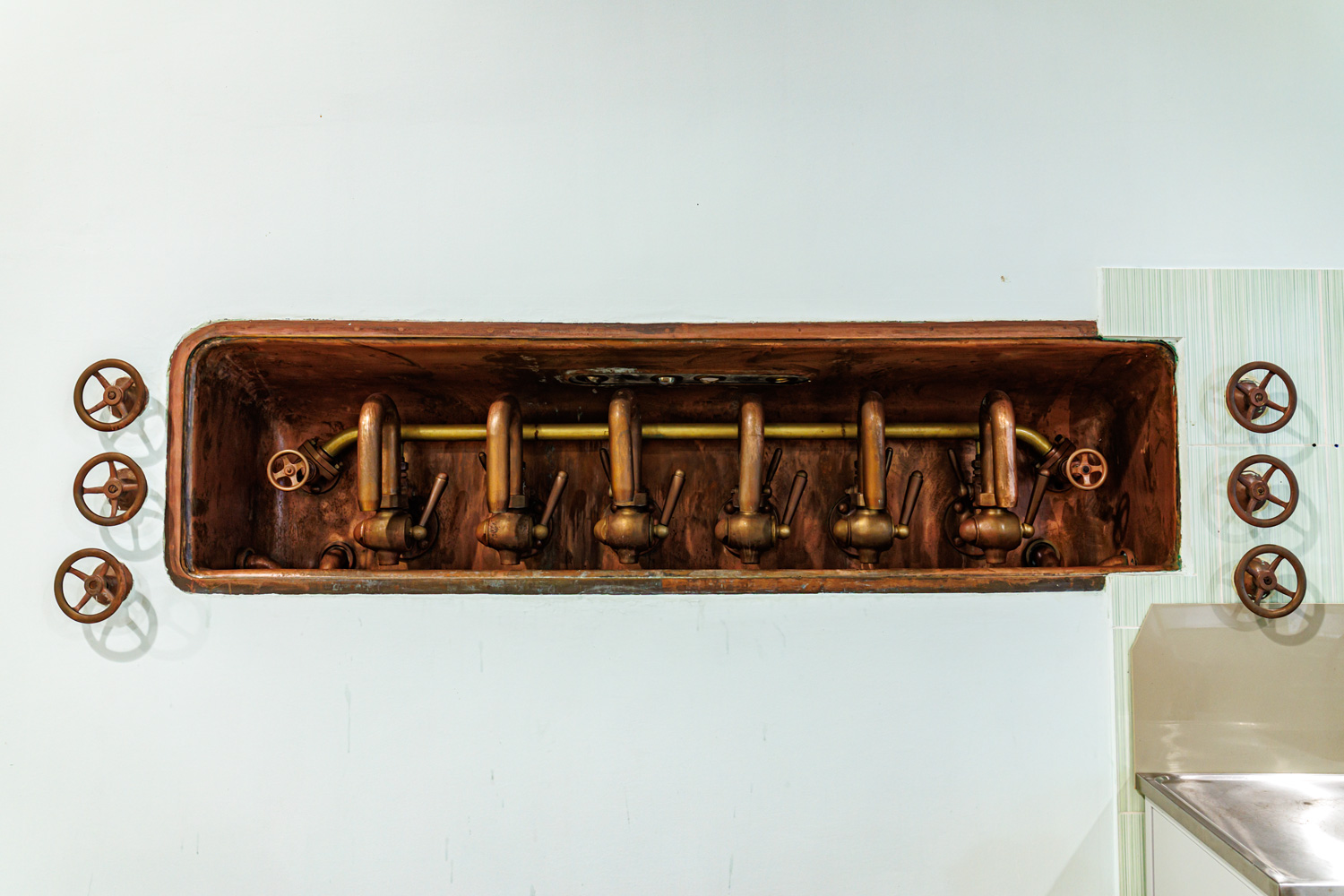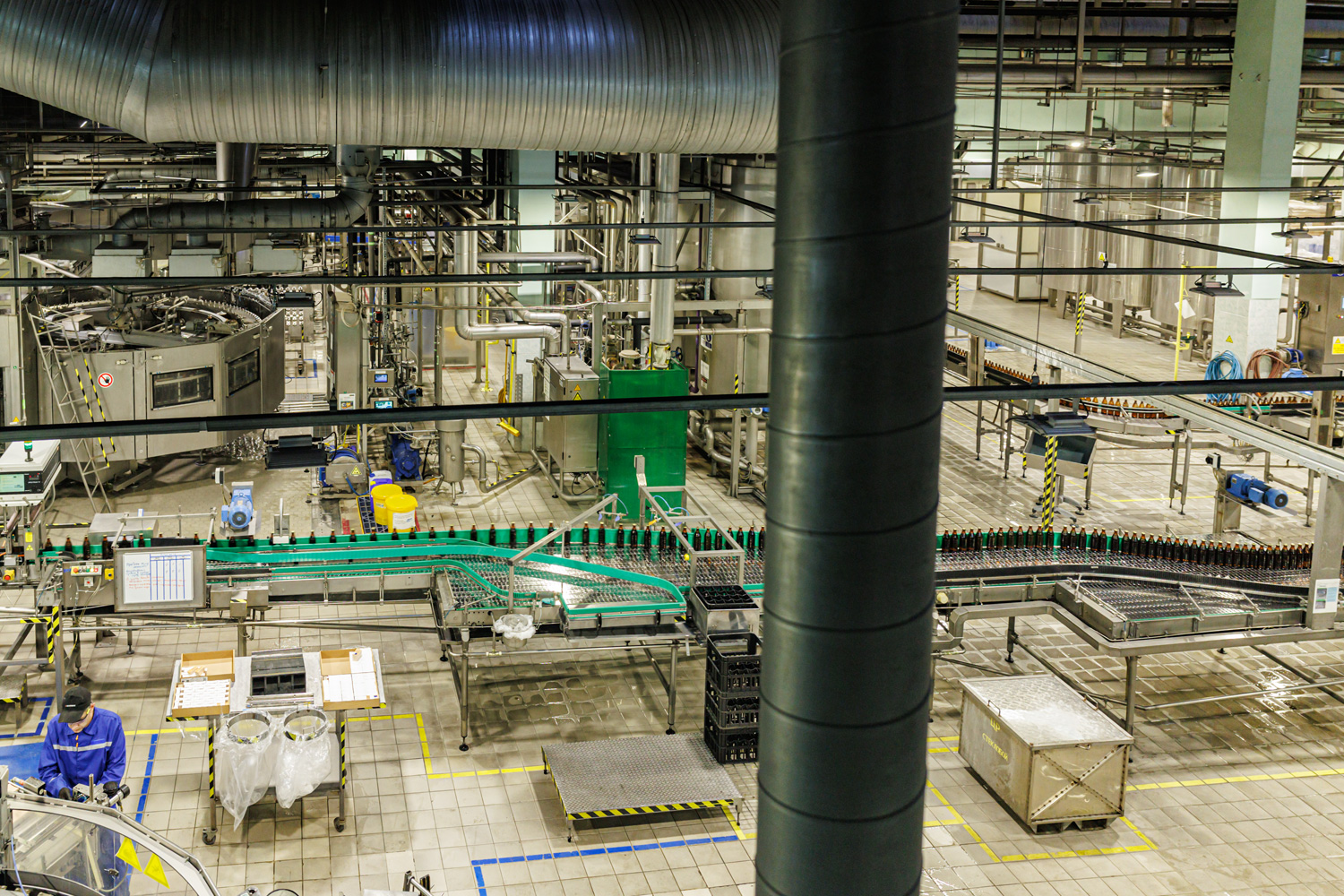 | Варочный цех. Сохранились медные чехословацкие котлы, но они используются только как облицовка для современных котлов из нержавейки. Старый пульт управления варкой тоже оставлен как музейный экспонат, сейчас все управление производится с помощью компьютеров из операторской. | ||||||||||||||||||||||||||||||||