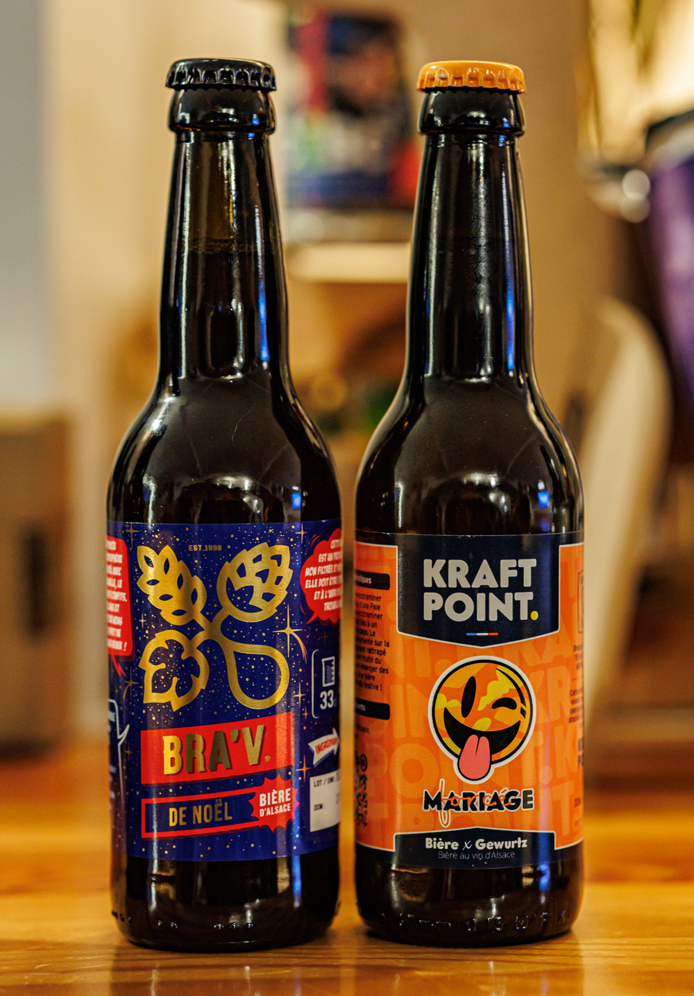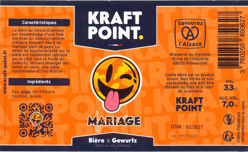 Bra'v - La Brasserie du Vignoble, "Bra'V de Noël" (Winter Ale) - типичное зимнее пиво - карамельные и темные солода и немного пряностей вроде корицы. Как Kraft Point Mulhouse, "Mariage Forcé" (Blonde / Golden Ale - Other) - по стилю это скорее грейп-эль, здесь добавлено вино (или виноградный сок), вкус потому блонда, но с тонами белого вина. Немного сладковато. |