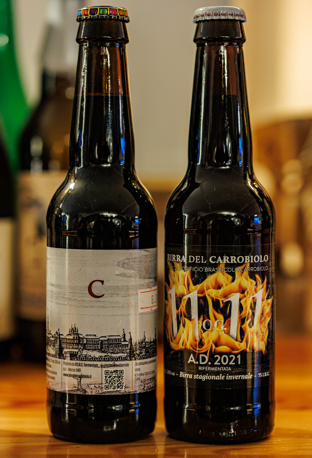 Birra del Carrobiolo, "Porcini Imperial Stout" (Stout - Imperial / Double - с белыми грибами, 10% алкоголя) - аромат очень грибной, правда пахнет не белыми грибами, а скорее поганками. Во вкусе грибов меньше, но они ощутимы, не давят, а создают некую изюминку. В остальном ощутимы темные и карамельные солода, алкоголь скрыт. "O.G. 1111" (Winter Warmer, 26% на 13% алкоголя, 77 ibu) - ощущается копченый вкус - прежде всего копченая груша хотя есть и слегка горелой резины. Высокая, но скрытая крепость, потому заметно и вино. Довольно сложно и интересно. |