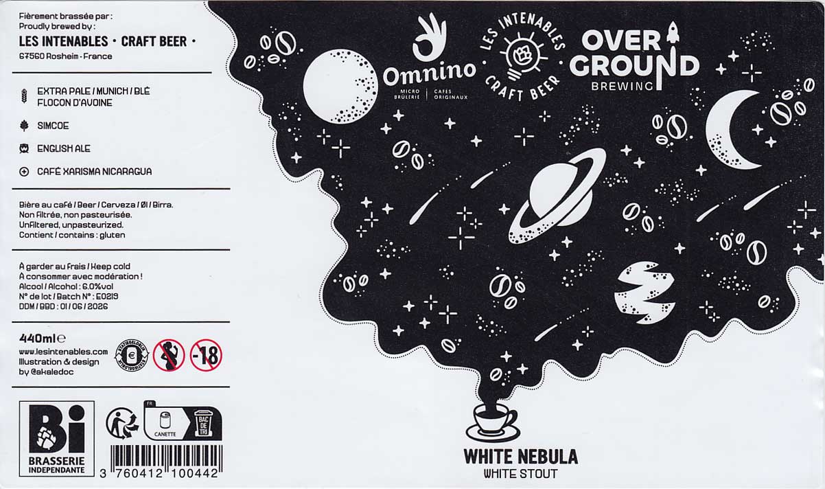 Les Intenables - Craft Beer (совместно с Overground Brewing), "White Nebula" (Stout - White / Golden) - светлый стаут, в аромате ощущается мощный кофе, во вкусе тоже есть кофейные тона - тем и намекают на то, что это стаут. |