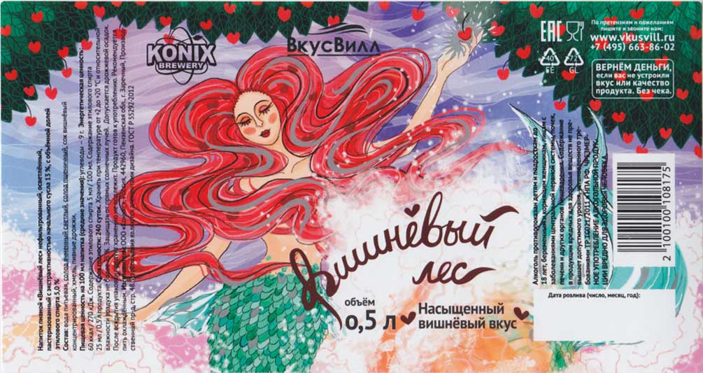 Вищневый лес. Светлое. Плотность - 13%. Крепость - 5% vol. Калорийность - 60 ккал. |