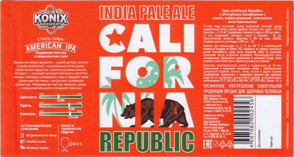 Республика Калифорния. Светлое. Плотность - 17,55%. Крепость - 7,2% vol. Калорийность - 65 ккал. |