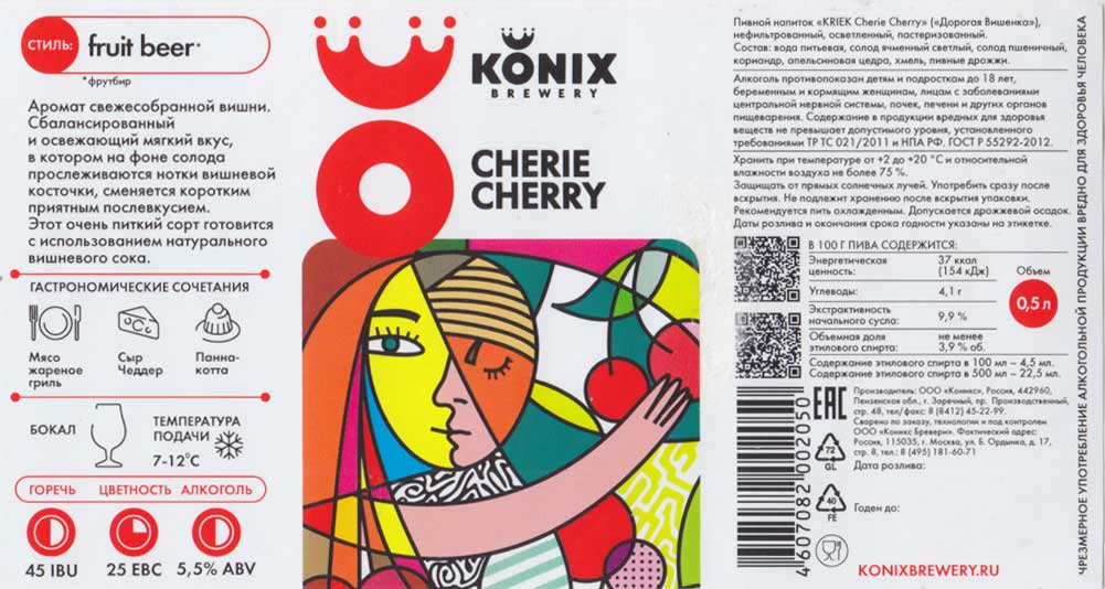 Дорогая вишенка (Kriek Cherie Cherry). Полутемное. Плотность - 9,9 или 13%. Крепость - 3,9 или 5% vol. Калорийность - 37 или 60 ккал. |