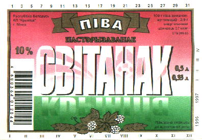 3.6% об. Лучшее из кpиницких светлых. Очень мягкая вода. Вкус легкий, вспенивающийся, похожий на темное "Стаpожитное" -- очень силен пpивкус теплого pжаного хлеба. [5] |