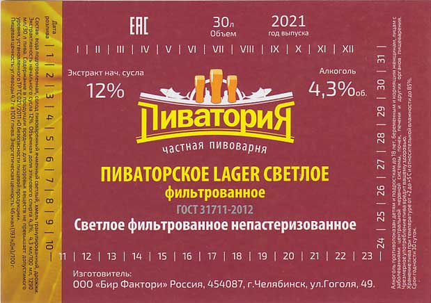Пивзавод Сайт завода Марка пива Цвет % Спирт Калл. Объем Файл этикетки