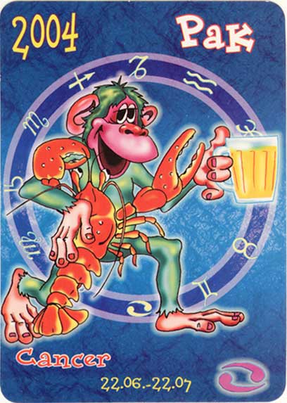 111. Выпуск ИПФ «Стезя». В: а) Рак с 22 июня по 22 июля. 9-0022 б) Котенок в кружке. 9-0037. в) Бочонок пива «Ахтуба», кружка «Балтика», котенок. 9-0042. |