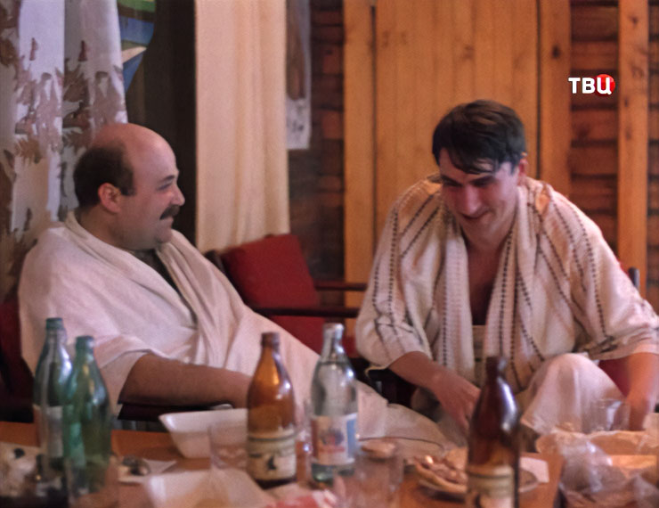 | "На Дерибасовской хорошая погода, или На Брайтон-Бич опять идут дожди" - российско-американская шпионская кинокомедия 1992-го года снятая на "Мосфильме", киностудия "Союз". Съемки фильма начались еще до распада СССР, в августе 1991-го года и это последний фильм режиссера Леонида Гайдая. Действие происходит в последние годы существования СССР, так что в бане агенты КГБ и ЦРУ по сюжету пьют еще советское пиво. Сцена скорее всего снималась в Москве, так что пиво должно быть одного из московских пивзаводов. Закуска - традиционная - раки, вобла и снетки - это кстати в сцене специально обыгрывается. Кружки стандартные граненые - "общепитовские". | ||||||||||||||||||||||||||||||