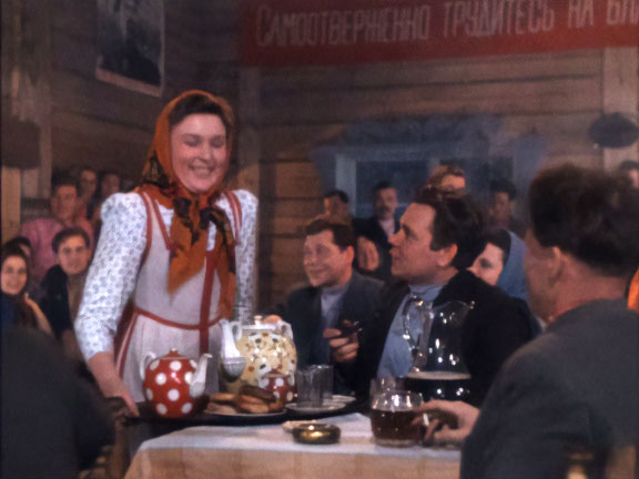 | "Сказание о земле Сибирской" - цветной музыкальный фильм, поставленный на киностудии "Мосфильм" в 1947-м году режиссером Иваном Пырьевым по сценарию Евгения Помещикова и Николая Рожкова. Это третий по счету цветной художественный фильм в отечественном кинематографе. Натурные съемки проходили в Сибири на территории Алтайского и Красноярского краев, Новосибирской и Иркутской областей. Значительная часть фильма снималась в чайной, где кроме чая - имеется и разливное пиво. Обслуживание - на высшем уровне - воду для чая кипятят в многочисленных самоварах, а заваривают и подают в чайниках разного объема, ну а пиво - разливают из бочки в кувшины (хорошо видна система розлива с ручной подкачкой воздуха для создания давления), которые уже разносят по залу, а посетители сами наливают его по кружкам. Кружки в основном - типа английских пабных, пузатых и с характерным рисунком в виде фигурных вмятин на стекле, а не граней. Видна и одна цилиндрическая кружка. Пиво в отдельных кувшинах и кружках смотрится совсем уж темным, хотя вероятно так вышло при съемке на пленку тех лет - ну и разливают очевидно "Жигулевское", а оно тогда было ближе к полутемному. В кадре много агитационных плакатов и портретов Ленина, а в оригинальной версии были и портреты Сталина, но их повырезали сократив общий хронометраж фильма на 10 минут. | ||||||||||||||||||||||||||||||