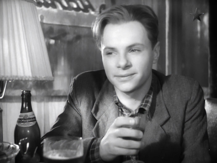| "У них есть Родина" - черно-белый художественный фильм, снятый на Московской киностудии художественных фильмов имени Максима Горького Александром Файнциммером и Владимиром Легошиным в 1949-м году по пьесе Сергея Михалкова "Я хочу домой". В 1951-м году за постановку этого фильма режиссеры были удостоены Сталинской премии третьей степени. Действие фильма происходит сразу после окончания войны, в западной части Германии, оккупированной западными союзниками. В фильме рассказывается о судьбе советских детей, угнанных нацистами в Третий Рейх. Девочка Ира отдана работать в кафе фрау Вурст, фактически пивную, потому что основным блюдом там является пиво. Обстановка в кафе вполне правдоподобная, можно видеть кран для розлива пива, пивные кружки и Фаину Раневскую (исполняющую роль фрау Вурст) это пиво поглощающую. Ну а Павел Кадочников, исполняющий роль советского полковника - пивом не интересуется. Роль немецкого города исполняет Таллин. |