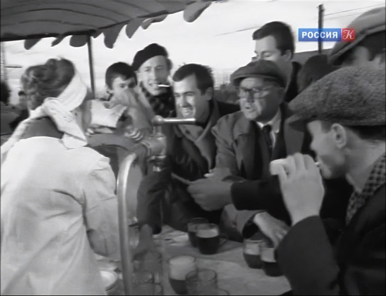 | В наличии пиво и в привокзальном буфете. Здесь его уже пьет главный герой, в исполнении Евгения Урбанского. Интересно, что и как в фильме "Коммунист" - герой Урбанского погибает. В кадре заметны кружки разной формы, как английские пабные, так и цилиндрические граненые и широкие. У буфетчицы видны и бутылки с этикетками, но качество картинки не позволяет их разобрать. Пиво - вероятно Белгородского пивзавода, имеющего дореволюционную историю, а вот в самом Губкине - уже в наше время работало три минипивоварни. |