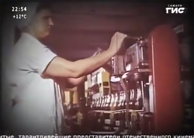 | В середине фильма, когда рассказ ведется о предприятиях города, повествование вновь возвращается к "Жигулевскому пивзаводу". Диктор читает: "по числу и масштабу предприятий Куйбышев может быть и похож на другие большие города, но "Жигулевский пивкомбинат" - остается единственным в своем роде. Этим куйбышевцы обязаны старейшине волжских пивоваров - Александру Николаевичу Касьянову". Нам показывают линию розлива, а также заводскую дегустацию пива. Среди бутылок слева видно "Московское", а справа - "Жигулевское" (цветовая гамма несколько необычная, но это явно от того, что пленка за полвека выцвела да и соседняя бутылка отбрасывает такую тень, в дальнейших кадрах цвет этой этикетки все таки становится ближе к привычной желто-синей). | ||||||||||||||||||||||||||||||||||||