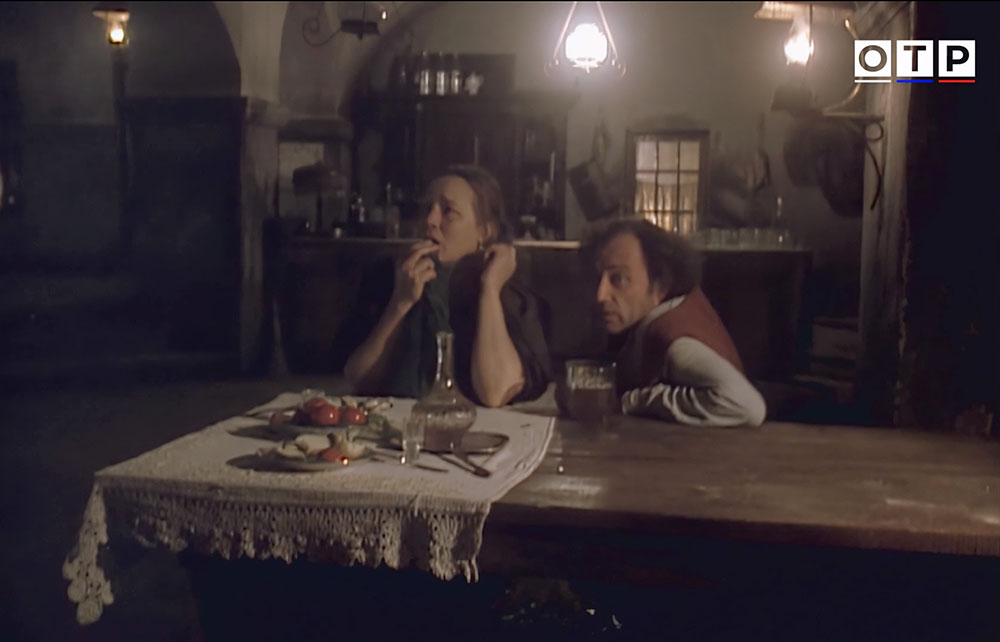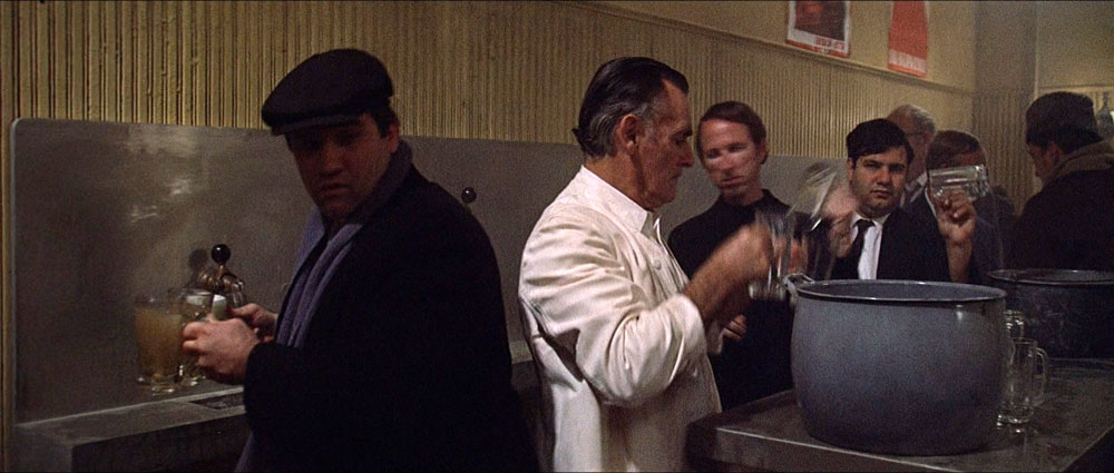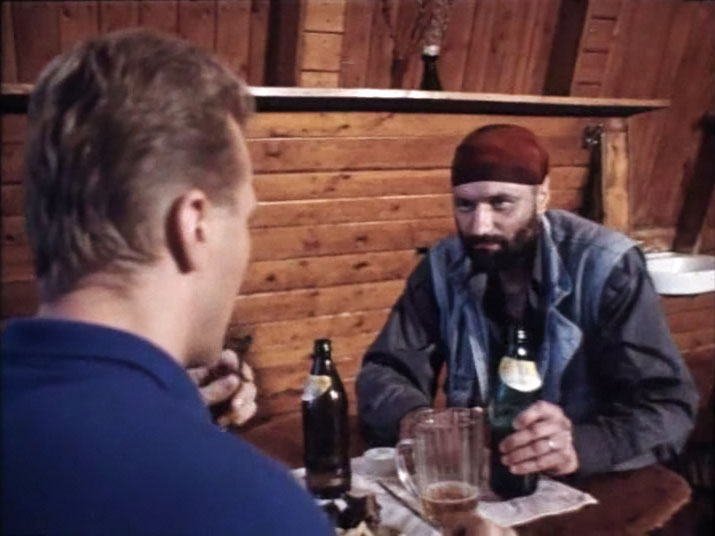 | Кроме пивной палатки, мы видим и пивную, расположенную прямо на ипподроме. Здесь имеется как разливное пиво, так и бутылочное. Скорее всего и то и другое - местного "Псковского пивзавода" - "Жигулевское", бутылочное почти точно, на этикетке слева явно видно черную кляксу - вероятно являющуюся гербом завода. Пиво пьют из общепитовских кружек, конечно подкрепляя выпитое водкой. Герой пьет водку из рюмки, но рассказывает байку - что правильнее ее называть лафитником (в этом он не прав). Пиво-медоваренный завод в Пскове построил Г. Г. Даниэльс в 1883 году (другие даты основания - 1884 и 1886 гг.). Еще до Революции - его чуть не снесли во время строительства моста для железной дороги Псков - Рига. Но завод пережил и Революцию, и Гражданскую с Великой Отечественной войной и закрыт был только в 1997-м году. Кстати, на Ипподромной улице в Пскове, в середине 70-х годов заработал еще один пивзавод, на базе местного пищекомбината облпотребсоюза, с югославским оборудованием. Но в кадре точно пиво не от него, так как этикетки "Жигулевского" у него были совсем другого - "потребсоюзовского" дизайна. |