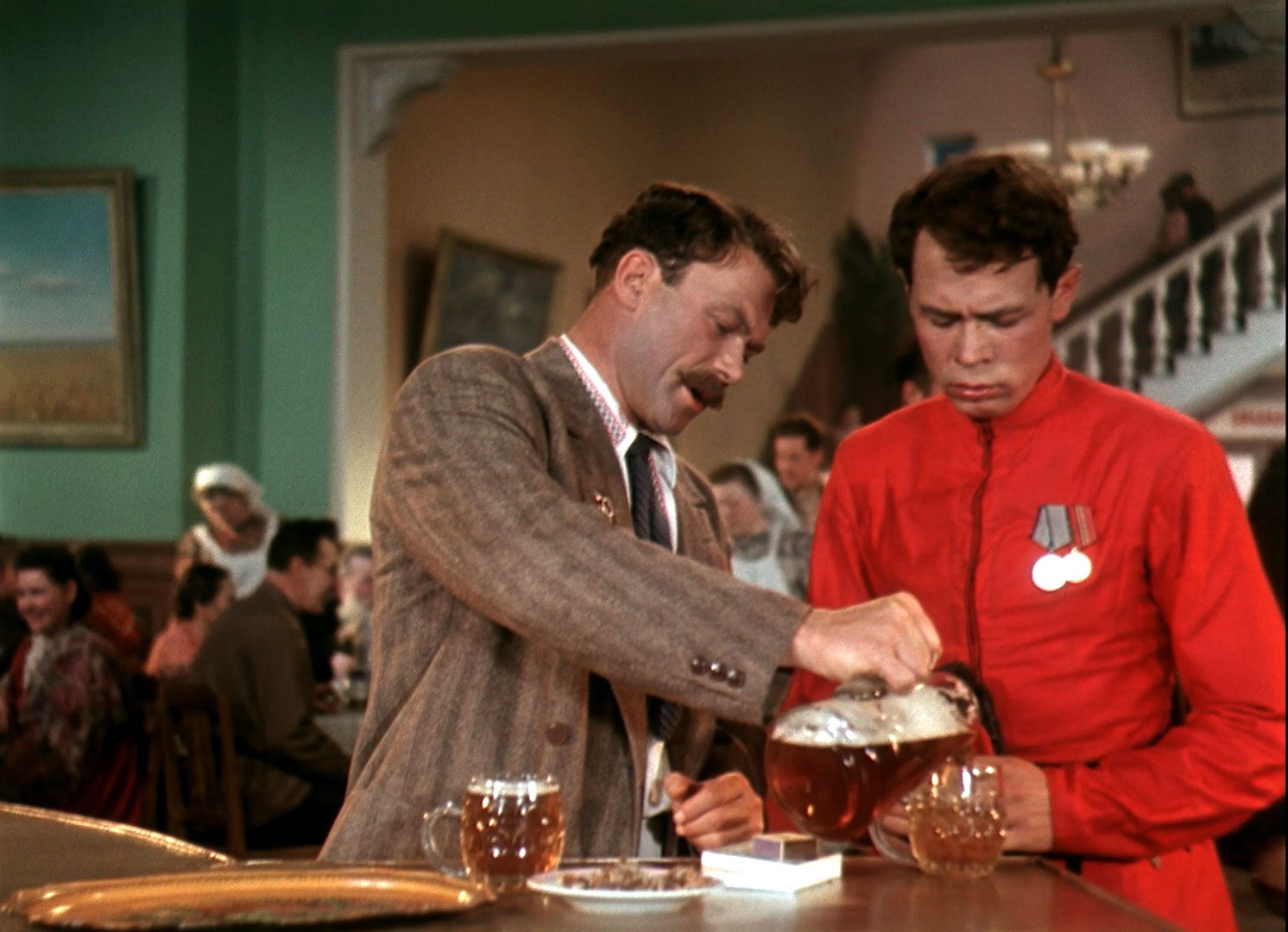 | Наконец, в сцене в ресторане (хотя помещение больше напоминает классический Дом культуры) показано одно из популярных видов подачи пива - когда его приносят в литровых графинах. Я сам такое видел например во всем известном ресторане "Жигули" на Арбате, пиво там приносили именно в стеклянных литровых графинах, предоставляя самим гостям разливать его по кружкам. В кадре здесь именно классические английские пабные кружки, которые как видим были в употреблении и в СССР, но не настолько часто как более традиционные граненые. |