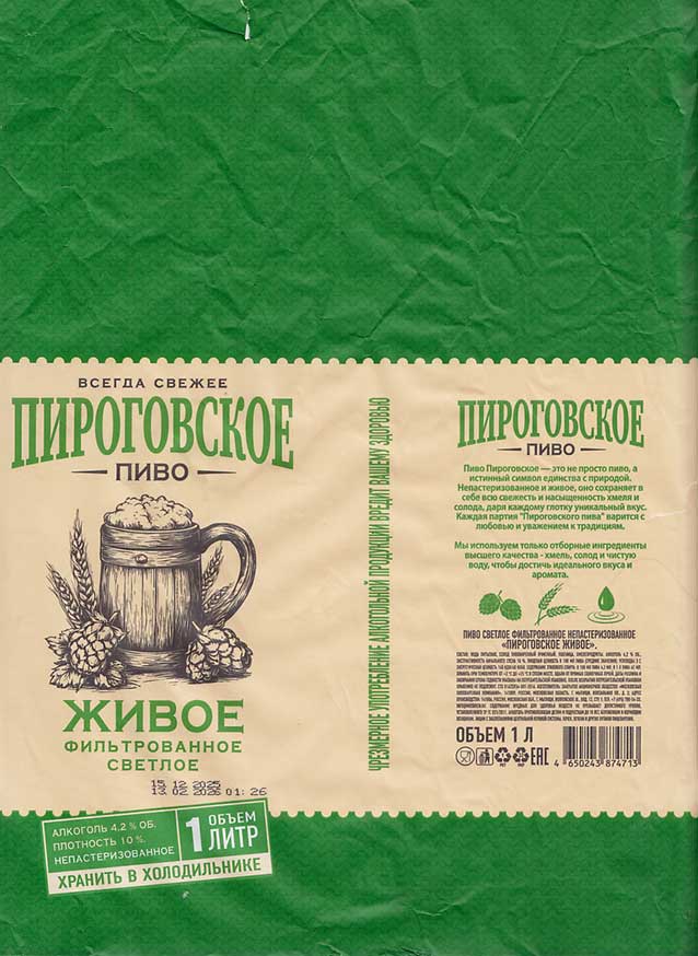 Пироговское, живое. Светлое. Плотность - 10%. Крепость - 4,2% vol. Калорийность - 40 ккал. |