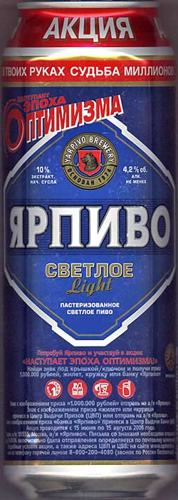 "Ярпиво, оригинальное" - вот его пили и разливным. Чуть кислило, но потреблялось лучше чем тарированное. Вкус казался более полный, даже были заметны легкие фруктовые тона (хотя может это от кислинки?). Бутылочное и баночное можно опять описать так - достаточно чистое и пустое. "Ярпиво, крепкое" не пили - этикетку подобрали. |