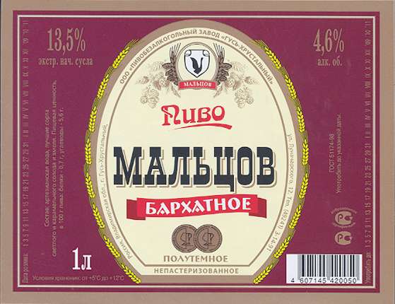 Гусь-Хрустальный. Линейка сортов достаточно длинная, и главное - не забыто темное! "Мальцов, бархатное" - более плотное чем сорт "Бархатное" варимый в СССР. Карамельный солод хорошо выражен, вкус достаточно чистый. "Мальцов, элитное" - этот сорт покупал и в Москве, в "разливайке" на Пражском рынке. Вкус мощный, плотный и карамельный. Также достаточно чистый, хотя присутствует небольшой "фирменный" привкус. | ||||||||||||||||||||||||||||||