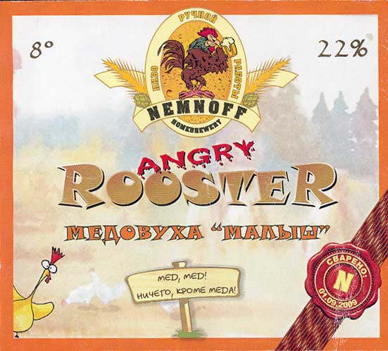 "Angry Rooster, медовуха "Малыш" (22%, 8%) - в отличие от "Angry Rooster, медовуха пряная" - это именно классическая медовуха, а не пиво с медом. Конечно преобладает сладкий вкус меда (и медовый аромат), хотя одновременно и с горчинкой. Сладость вполне умеренная (но не до сухости), чуть пряное. Крепость чувствуется лишь слегка, хотя пьянит весьма сильно. Довольно игристое. Нет дрожжевого привкуса бражки.