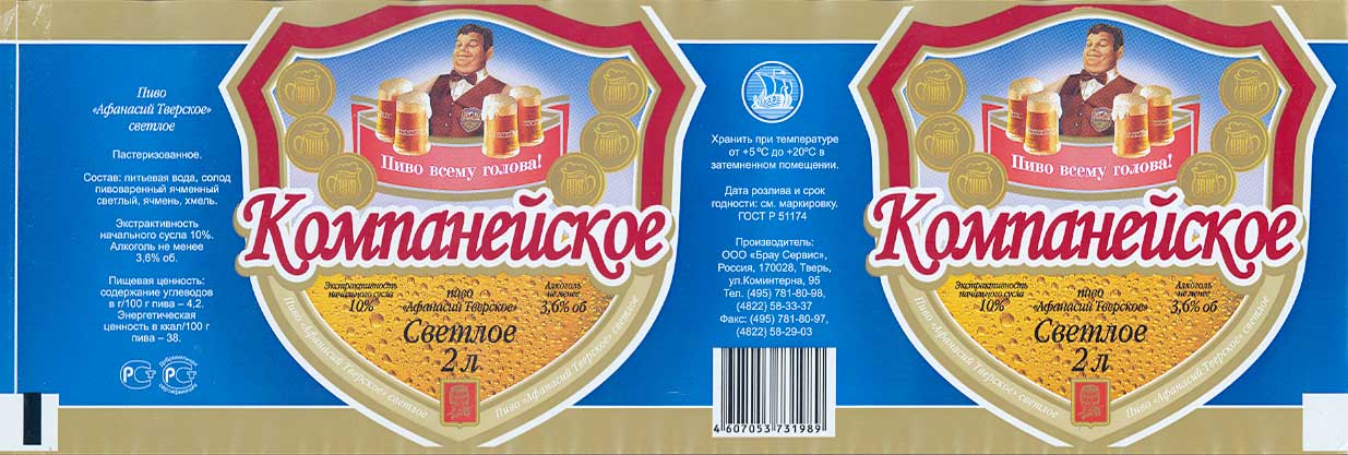 Тверь, "Тверское", но под маркой "Компанейское", продается в Перекрестке. И здесь вкус только умеренно чистый, заметен типичный для Твери "горелый" привкус. Пиво очень легкое, но не кажется водянистым (именно из-за привкуса). Хмеля нет. Пьется легко, это все таки летний сорт пива, для жары. | |||||||||||||||||||||||||||||||