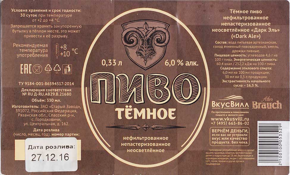 | Во "Вкус Вилл" купил и "Дарк Эль" от "Старого Завода" - вот оно не порадовало, уже начало кислить, хотя срок годности еще не истек. |