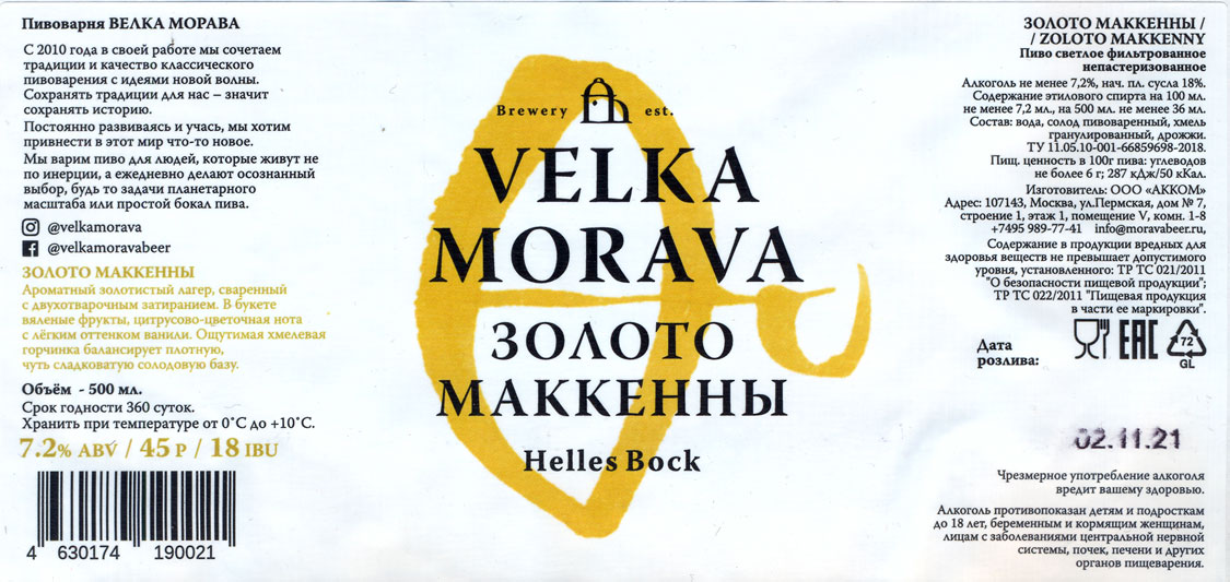 | "Велка Морава", "Золото Маккенны" - светлый бок, даже ближе к доппельбоку (плотность 18%). Вкус солодовый, умеренно полный (хотелось бы больше плотности), алкоголь слегка заметен и вот его бы и надо было прикрыть полнотой вкуса. |