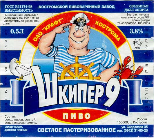 Еще одно слабенькое пивко из Костромы. "Шкипер 9". 9 - это не крепость, а плотность, так что по содержанию алкоголя это пол (а то и треть) бутылки "Балтики 9". В ПЭТе вкус у этого пива неплохой, даже цветочками отдает. В бутылке же, обычное слабенькое пивко, для утоления жажды в жаркую погоду. |