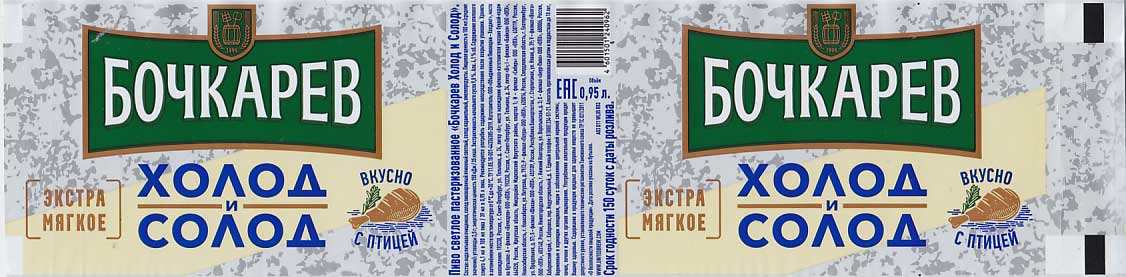 | И из пивгигантов остались у нас "Объединенные пивоварни - Холдинг". Этикетки (на бутылки и ПЭТы) сорта "Бочкарев, холод и солод" переработали и теперь акцент сделан на слове "Бочкарев", очевидно бренд будут продвигать активней. По вкусу - это тоже достаточно чистое и достаточно пустое и питкое пиво без намека на хмель. |