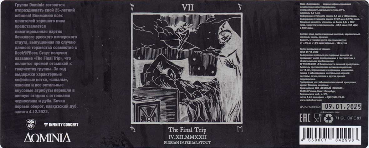 | "Красный пивовар", проект Rock'n'beer, "The final trip" - сухой и кислый имперский стаут, вкус винный, на заднем плане карамельные и темные солода. | ||||||||||||||||||||||||||||||