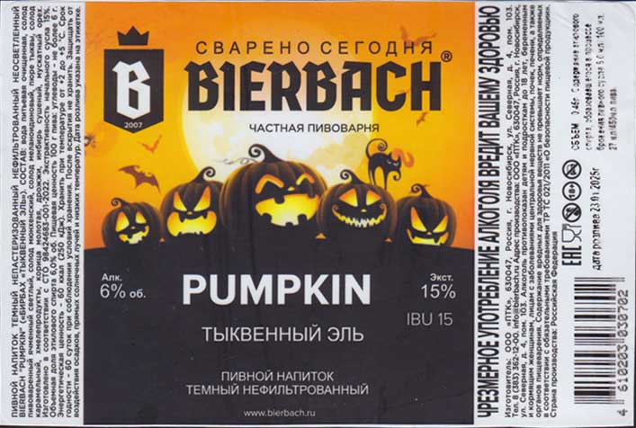 | ООО "ПТК", Новосибирск. "Гамлет" - достаточно чистый и ровный лагер, слегка охмеленный. И под брендом Bierbach - "Pumpkin" ("Тыквенный эль") - не сильно яркий, но с явными специями в виде корицы и имбиря, а также привкусом булочки. | ||||||||||||||||||||||||||||||