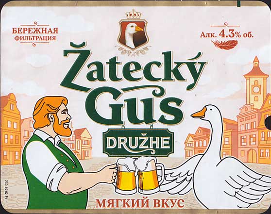 | "Жатецкий гусь, друже" - пополнение линейки "Жатецкого гуся". Как обычно, предлагают не больше жатецкого хмеля, а больше "мягкого" вкуса (то есть меньше хмеля). Плотность около "деситочки" - вкус легкий, солодовый. |