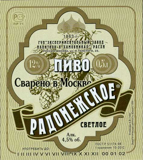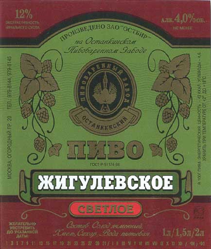 Пиво Останкинского пивзавода. Широко известно. Особо интересен вариант "Жигулевского" - 12% плотности, вероятно это опечатка - всегда "Жигулевское" было 11%. |