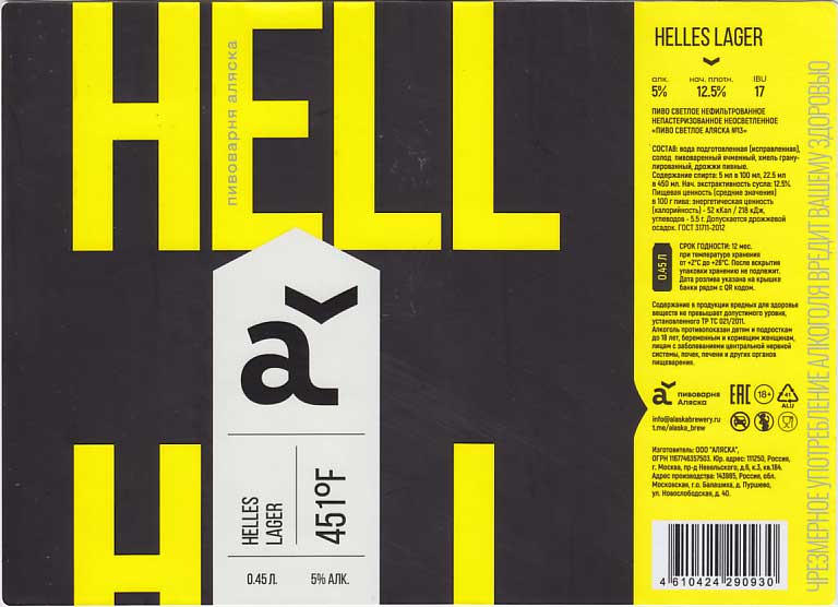 "Аляска", "Хеллес 451°F" - осенней варки, но уже был небольшой гашинг. Вкус достаточно чистый, солодовый, хмеля не много, и скорее это просто лагер, а не конкретно немецкий хель. |