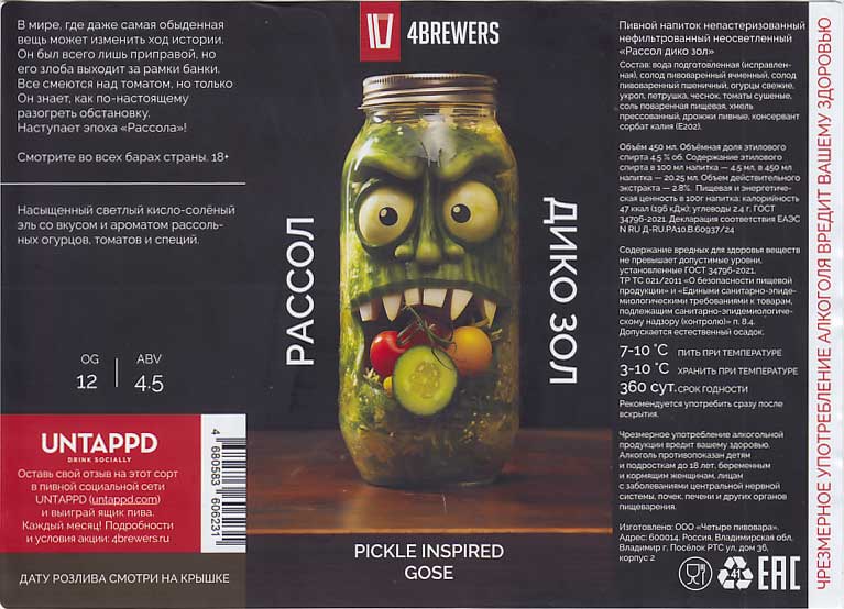 | 4Brewers, "Рассол дико зол" - аромат и вкус огуречного рассола (вернее рассола из маринованных огурцов). Кисло-соленый вкус, очень яркие специи в виде укропа, хорошо освежает и даже отрезвляет. |
