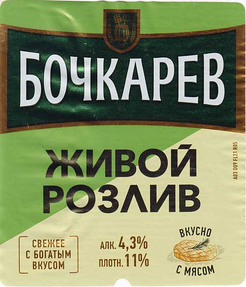 | "Объединенные пивоварни - Холдинг", "Бочкарев, живой розлив". На данной этикетке нет значка типографии, так что как вариация - пошла в мою коллекцию этикеток. Слово "Бочкарев" - теперь выделено, компания пытается возродить популярность этого бренда. Ну а по вкусу - "евролагер" - чистый, пустоватый, едва солодовый, в общем питкий, хмель не заметен. |