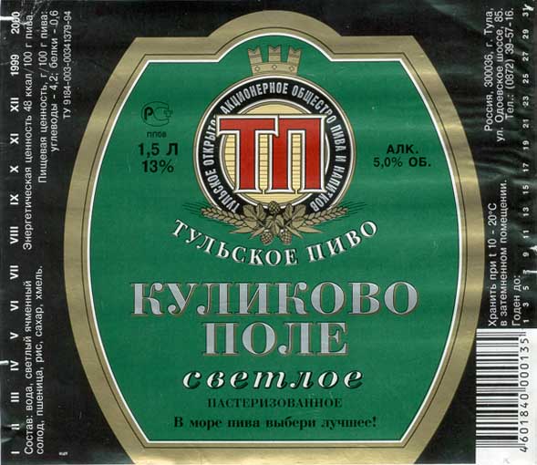 "Куликово поле" вышло в 1,5 литровом ПЭТе. В общем неплохое пиво. Более мягкий, по сравнению с бутылочным, вкус (из-за меньшей газированности). |