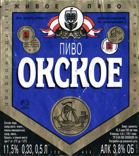Перейдем, наконец, к пиву из самого Нижнего. "Окское" - непастеризованное (как и все остальные сорта) - легкое пиво - в стиле "Жигулевского". Приятно пьется в жару. Стоит 5 с чем-то рублей. |