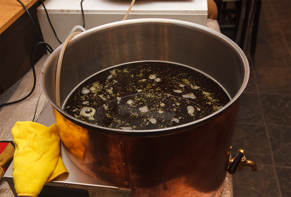 | Пивной "крафтовый" бар "Бутылка, кружка и котел", носит такое название потому, что в нем, кроме разливного пива, можно приобрести и бутылочное, а также, в нем регулярно проводятся варки пива, на установленной здесь микропивоваренке. Варят на ней пиво люди известные в пивоваренной среде, в этот раз Антон, владелец заведения, пригласил на варку нас - Союз Южно-Московских Пивоваров. Оборудование здесь тоже от компании МирБир, а именно "BRUMAS II Pro Set Premium", производства Германии. В прошлой раз, подробно писал о заторном котле от МирБира, теперь было интересно поработать и на более серьезном оборудовании. Пивоваренка обделана медью и смотрится очень эффектно, конечно, ее основное назначение - украшать зал какого-нибудь пивного бара, в котором сваренное на этой пивоваренке пиво и будет продаваться. Может в Германии подобное и осуществимо, но у нас в стране, на получение необходимых документов нужно будет потратить столько времени, денег и сил, что оправдать эти вложения не удастся никогда. Поэтому, пиво в "Бутылке, Кружке и Котле" хоть и варится регулярно, но не продается, его попробовать могут только участники варки, ну и если кому-то повезет из простых посетителей. Конечно дизайн пивоварни превосходный, но посмотрим что у нее внутри. Пивоварня двухпосудная и состоит из заторного котла с фильтрационной системой и варочного котла, который также играет роль парогенератора и вирпула (режим вирпула, используется и при мойке пивоварни). К варочному котлу приделан модуль нагрева с насосом и блок управления. Модуль нагрева забирает насосом из варочника воду (или сусло, при его варке), нагревает и возвращает обратно. Варочник герметично закрывается сверху декоративным медным колпаком, сверху крепится силиконовая трубка, которая ведет к заторнику и нагревает сусло в нем паром (кроме этого, пар из этой трубки, поднимаясь со дна заторника, перемешивает затираемое сусло, так что мешалка здесь не нужна). Эта же трубка, используется для спуска фильтрованного сусла из заторника (интересно, что крана у заторника вообще нет, чтобы пустить сусло, трубку нужно просто опустить ниже уровня дна заторника). Температура при таком обогреве затора держится очень точно (измерение производится с помощью длинного металлического щупа, опущенного через декоративный колпак (в версии "стандарт", этой пивоварни, такого колпака нет), щуп подсоединен к блоку управления). Однако подъем температуры в заторнике осуществляется очень медленно, поэтому процесс затирания растягивается на несколько часов. В нашем случае, заторник просто поставили на индукционную плиту мощностью 2 КВт., что сразу сократило процесс затирания в разы. Система фильтрования полностью аналогична той, что мы видели в отдельном заторнике от МирБира. Это сетка, закрывающая центр дна, крепимая к нему гайкой и силиконовая трубка, которая расположена под сеткой. Правда, как я отметил выше, отсутствует кран, а трубка, используется еще и для доставки пара нагревающего сусло. |