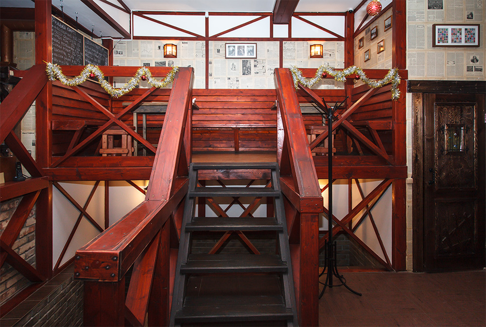 После записи передачи, мы отправились в фирменную пивную от пивзавода "Вятич" - под названием "Пивной дворик". Здесь в наличие - практически весь ассортимент пива завода как в разливном, так и в бутылочном виде, а цена поллитровой кружки - 65 рублей! Закуски есть на любой вкус и кошелек (правда они не настолько дешевы, в отличии от пива). Зал ресторана был забит до отказа, при этом царило шумное веселье в манере баварских биргартенов. Фотографий я не сделал, но заснял интерьеры бара на следующий день, когда наша компания, после ознакомительной экскурсии по городу Киров зашла отобедать (народа в это время, почти не было)...