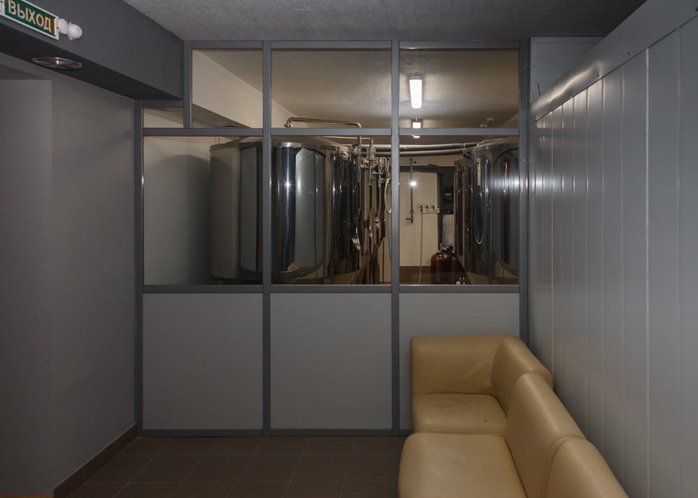 | Сейчас в бродилке установлено шесть однотонных цилиндро-конических танков брожения (и оставлено место еще для нескольких). Брожение и дображивание производится в одном танке. Рядом расположена комната с водоподготовкой (используется установка обратного осмоса), солододробилка, а также комната-холодильник, в котором хранится готовое пиво розлитое в ПЭТ-кеги, часть из них подключена к кранам на стойке, часть к "пегасам" для розлива в ПЭТы. | ||||||||||||||||||||||||||||||
