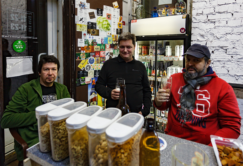 | Магазин "Путь к живому" - типичная "разливайка", на кранах преобладают региональные заводы, немного минипивоварен и крафта. В холодильниках - немного импортного пива от Бельгии до Германии и неплохой ассортимент отечественного крафта. Продегустировать можно на месте, имеется пара стульчиков и доска вдоль стены вместо столика. Конечно в наличии всяческая закуска под пиво. За то время, что мы (а собрался почти весь Союз Южно-Московских пивоваров) провели в магазине, покупатели брали в основном простенькое региональное светлое, но двое основательно набрали бутылочного и баночного крафтового пива, а один покупатель взял 3 бутылки крепких и кислых бельгийцев по 0,75 л. А приглашены мы были владельцем разливайки Сергеем, чтобы попробовать пиво от новой белорусской минипивоварни Браунинг Бир (из Солигорска Минской области). В ароматике мне почудился пластик, но может это был аромат самой пластиковой тары, в остальном пиво было вполне чистое. "Браунинг Льеж" - приличный лагер, нормально охмеленный (в сравнении с ним, наш малоярославский "Гренадер" охмелен куда меньше), достаточно полный, ровный и питкий. "Браунинг Бастонь" - вполне правильное немецкое пшеничное, с бананом и гвоздикой и легкой кислинкой. Из бутылочного продегустировали три портера. "Nord Stream" от Selfmade Brewery - балтийский портер, умеренно плотный, полный и крепкий, не сильно сладкий с карамельными и жжеными тонами. "Raspberry Porter" от Paradox - малина была очень яркая, тело мощное, с карамельными солодами, а в целом вкус весьма гармоничный. И "Docker" от Brew Division - он произвел самое лучшее впечатление - мощные сухофрукты во вкусе и тона портвейна. Яркие темные солода, немного сладковато, но в меру. А куплен был "Docker" как раз в соседней разливайке, к ней и перейдем. |