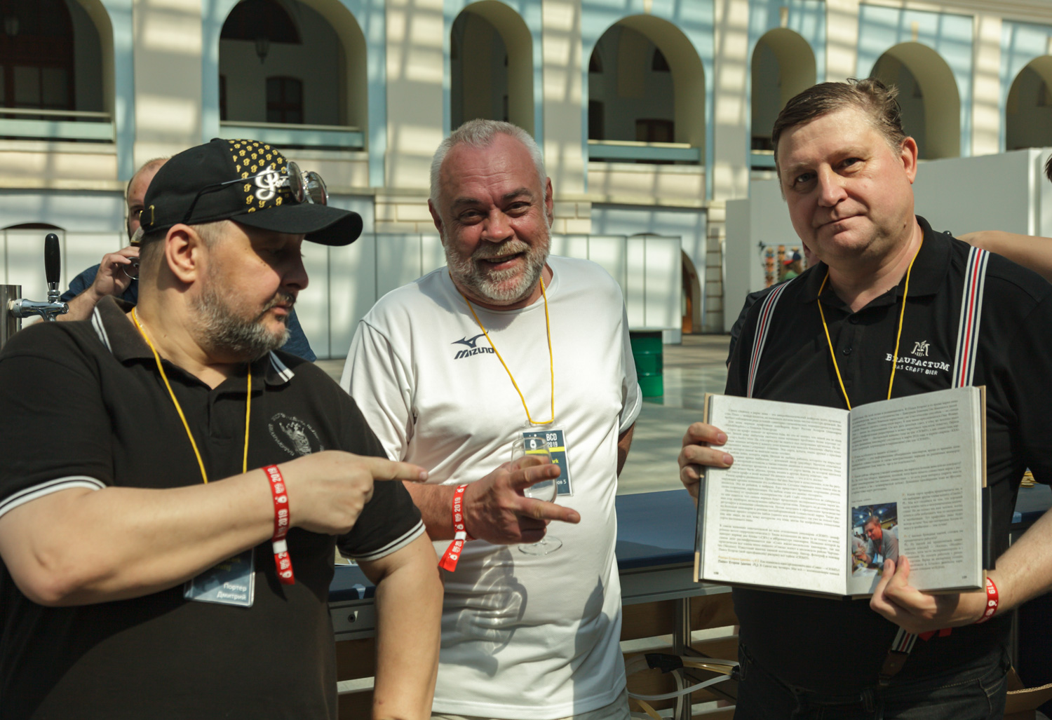 | Продолжение, начало смотрим здесь... Собственно про пиво. Интересно, когда-то все жаловались, что в продаже бывает только три вида пива - светлое, красное и темное (ну и иногда пшеничное). И вот, крафтовая революция в разгаре и что мы видим? Да те же три вида - только теперь это IPA, Sour и Stout (ну и иногда бельгийское)! ;-) Правда смотрю еще меды пошли в ход! Хотя, может это просто от количества основных вкусов? Кто любит горькое - IPA, сладкое - Stout, кислое - Sour? ну еще соленое - Gose... В любом случае - меня весьма впечатлили почти все попробованные сорта в стиле русского имперского стаута, почти все меды, а из кислых сортов хороши были с томатом и сельдереем - не равнодушен я к этим овощам! Смотрю, что в моду вошли micro IPA - может для жары это действительно самое то... В фестивале принял участие и наш "Союз Южно-Московских Пивоваров" - в Жаворонках, на Lark Craft, совместно с Михаилом Пихуром были сварены в свое время (полтора года назад!) пара сортов, вот пришло время их пробовать. Еще два сорта от Lark Craft сварены совместно с Андреем Щербининым и его Cidreria 13 (большим специалистом по меду и травам). В итоге от Lark Craft выставлялись: "Amber Lark" (Barleywine, плотность - 40%, алкоголь - 18%) - полтора года выдержки, по вкусу - портвейн. Слышал мнение, что это куда ближе к РИС, но в засыпи нет темных солодов и даже наоборот - добавлен пшеничный солод для уменьшения цветности. Но цвет да - красно-коричневый. "Яблоко на меду" (Cyser (Apple Melomel), 40%, 15%) - яблочное вино (чем-то смахивает на советское "плодово-выгодное" ;-). Чтобы стать шедевром, пожалуй чуть не хватает большей яркости, но может и спокойный вкус тоже хорошо... "Фламандский эль по-царски" (Flanders Red Ale, 21%, 7,5%) - выдержка тоже полтора года и странно, но за последние полгода стало меньше кислотности и бальзамического уксуса, но больше карамели и даже жженки. Так что вкус несколько сместился к кислому квадруплю... "Дед Пихур" (Braggot Gruit, 40%, 18%) - разливалось немного мутноватым, но эта версия очень хорошо выброжена, под 19% алкоголя. Так что сладость более сбалансированная, а пряные травы все также ярки. И это уже не портвейн, а молдавский вермут ;-) И это - самое крепкое пиво фестиваля (из невымороженных, хотя и некоторые сорта с выморозкой проигрывают в крепости)! На фестивале, была презентована книга Романа Егорова "Российский крафт" (Москва, Эксмо, 2019) в которой много и про СЮМП и про Lark Craft. Собственно первые фотографии - как раз с этой книгой, ну и на первой - я сам, а то больше моих фотографий в репортаже нет... |