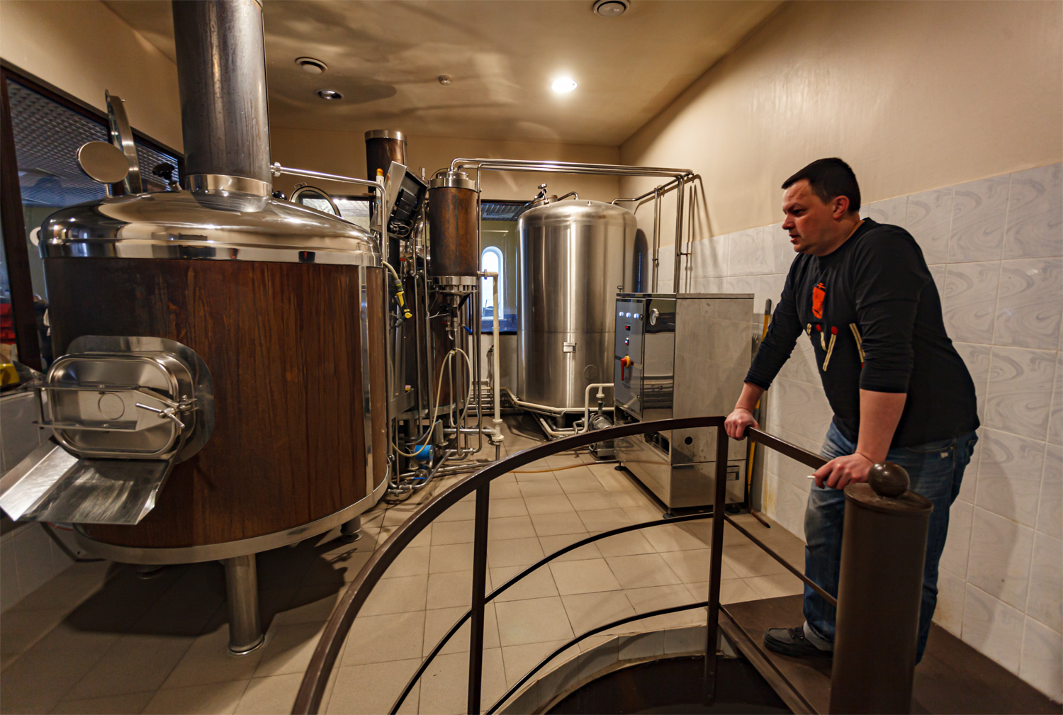 | Monbeer brewery (ООО "Монплезир") основана в 2013-м году и расположена во Фрязино, в отдельном строении, недалеко от станции. Планировалось запустить целый комплекс - ресторан-пивоварня, гостиница, баня, пивные ванны. В итоге работает только пивоварня, хотя и ресторан готов, да и один из номеров гостиницы время от времени сдается. В ближайших планах открыть хотя бы магазин при пивоварне. Пока попить пиво местного розлива можно в расположенном напротив пивоварни баре "Печка". Название пивоварни мало что скажет биргикам, хотя наверняка пиво сваренное на ней все пробовали. Monbeer активно сдает свои мощности для варок по контракту, у них варились и "Велка Морава" и "Заговор" и "Коникс" и "Хичкок". Недавно делал репортаж о пиве "Laddie ale, scottish gold" от Black spot brewery, так оно тоже сварено на "Монплезире". Свои собственные марки тоже выпускаются, но основной объем продается в окрестностях Фрязино, а в московских барах Monbeer часто выдается просто как фирменное пиво заведения. В итоге, бренд Monbeer московскому потребителю практически не знаком. Оборудование на пивоварне - просто отличное. Варочник компании Zip, по ресторанному отделан медью, управление компьютерное. Он стоит за стойкой, за стеклом в еще не открытом ресторане. Варки максимум на 850 литров, хотя обычно варится полтонны, так как танки брожения - на тонну или две. Бродильный цех расположен под пивоварней, туда ведет винтовая лестница (там же расположен вирпул и другое вспомогательное оборудование). Тонные танки - тоже от Zip, двухтонные - MBS и воронежская Pinta. Имеется система автоматической мойки, кизельгуровый фильтр. Водоподготовка простая, но водопроводная вода в городе - из скважины. Имеется полуавтоматическая линия розлива в бутылки. Солода как российские, так и импортные, кроме пива активно производятся (и разливаются) лимонады. О пиве. Собственные марки: "Monbeer, лагер" - фильтрованный, но вкус скорее классический для "жЫвого-нефильтрованного" - чистое, солодовое, очень слегка охмеленное и немного "подвальное". "Monbeer, пшеничное" - пшеничный лагер, из-под танка - освежающее, хлебное, практически не отличимое от обычного ячменного лагера. Также попробовали из ПЭТа который простоял в холодильнике неделю - появились заметные фруктовые тона, прежде всего персиковые. "Monbeer, красное" - очень карамельное и мне показалось чуть маслянистый вкус от этого. Новинки - "Шотландский эль" - мягкое, бархатное, питкое пиво с легкой жженкой во вкусе. "ДИПА" - ароматная, заметны цитрусы, тропические фрукты, хвоя. Умеренно сладковатое, что балансирует хмелевую горечь, в итоге - не кажется таким уж горьким и потому весьма питкое. Еще пробовали "Сессионное ИПА", не записал для кого сварено - довольно ароматное, цитрусовое, в целом легкое и питкое, с небольшой горчинкой. Контрактные варки. Для пивоварни Altermann: "Milk stout" - яркий шоколадный и кофейный вкус, полно и мощно, хотя пиво только умеренно плотное. "Stout fruit" - с черникой и черника отлично дает о себе знать, при этом гармонично смотрится на фоне темных и карамельных солодов. Серия фруктовых пив "Altermann Africa". "Kenya" - с мятой, киви и лаймом. Вкус лимонада "Мохито", алкоголь совсем не заметен. "Congo" - с манго и бананом. Ну это что-то в стиле лимонада "Буратино", так сказать "вкус знакомый с детства". Детишкам бы понравилось, но в данном случае не для них, 5% алкоголя. "Tanzania" - персик и маракуйя - ну да, этакий персиковый сок с
