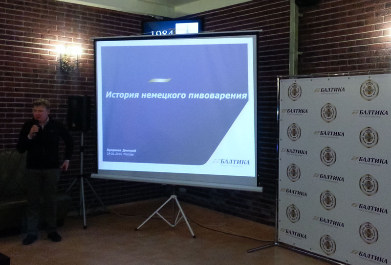 | 24 января, пиво-просветительский проект компании Балтика - "Пивной сомелье" - провел в Москве первую лекцию сезона 2014 г. Лекция была посвящена немецкому пиву и традиционным немецким закускам и приурочена к выводу на рынок Балтикой лицензионного сорта "Warsteiner". В первой части встречи, Дмитрий Булдаков, прочел весьма познавательную лекцию об истории пивоварения в Германии. Затем главный пивовар Warsteiner - Томас Нойзнер - рассказал об особенностях современного пивоваренного производства в ФРГ. |
