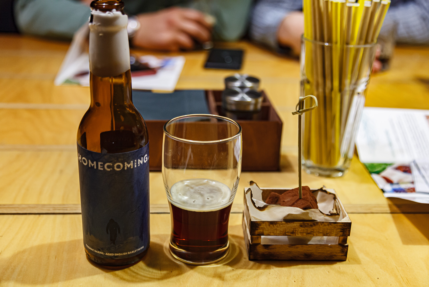 | Следующая закуска - Шоколадный трюфель под барливайн "Homecoming" от Knightberg и русский имперский стаут (при чем выдержанный в бочке из-под островных виски) "Smoky island" от Jaws. Конечно РИС от Jaws обладал мощнейшим вкусом с тонами торфа и йода, но пожалуй к этому десерту лучше подходил барливайн - более спокойный, но крепкий, винный с тонами сухофруктов. Подача десерта - в миниатюрных деревянных ящичках. | ||||||||||||||||||||||||||||||||