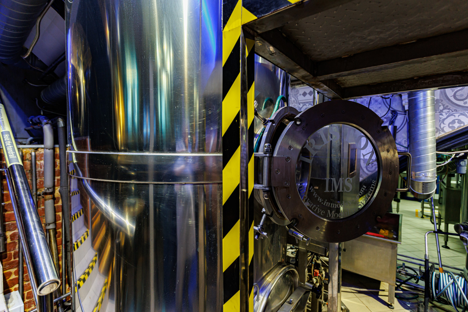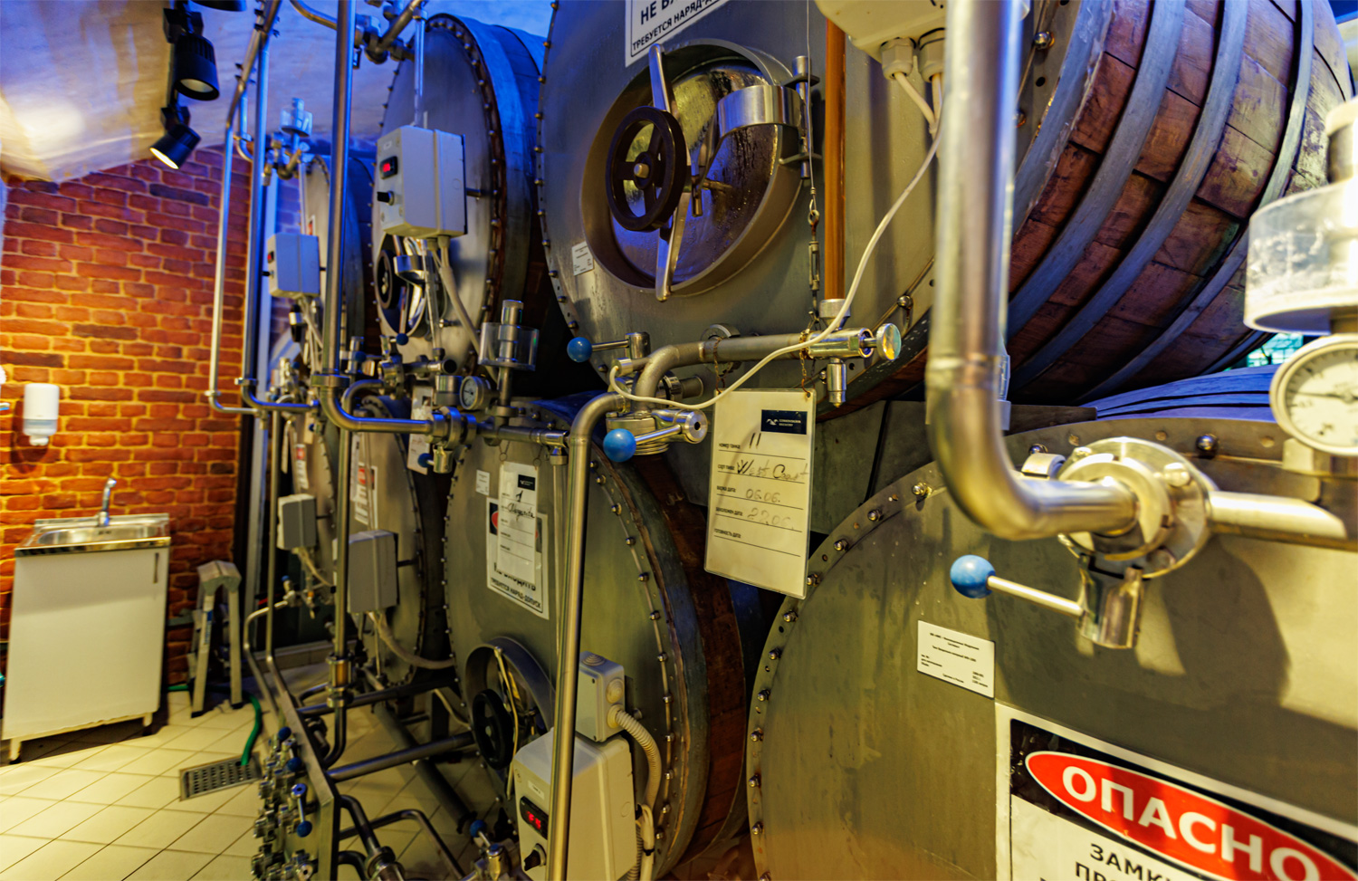 Ресторан и пивоварня расположены на Рождественской улице, 29. Экскурсию по пивоварне провел главный пивовар Илья Потапов. Оборудование здесь - крафт из крафта - всего на 200 л. Производит их российская фирма "ИМС - Инновационные модульные системы", патенты на технологию принадлежат Кайтукову Чермену Михайловичу, а сам варочник носит название "Иристон". В одном корпусе собраны заторник (в виде барабана, как в стиральной машине), варочника (он расположен сверху) и вирпула (он снизу). Пиво затирается в мешке (процесс напоминает стирку в машинке), потому не важна степень помола (и можно варить например - пиво из 100% пшеничного солода). Обычно в засыпи используется 40 кг. солода, а плотность сусла меняют количеством воды на затор (так что чем плотнее сусло, тем меньше его выходит). Преимущество такого затирания - больший выход по плотности и практически мгновенная фильтрация (в этот момент барабан включается "на отжим"). Один из недостатков - повышенная мутность сусла. Танки брожения - горизонтальные, на одну тонну, они стальные но отделаны деревом и заполняются за пять варок (или больше, если сусло плотное). Больше всего места на пивоварне занимает линия розлива в бутылки, хотя используется она не так уж часто. В остальном же, оборудование размещено настолько компактно, что протиснуться можно с большим трудом. И хотя сама пивоварня - скорее "микро", для экспериментов используют еще меньший варочник и два ЦКТ скорее домашнего размера. |